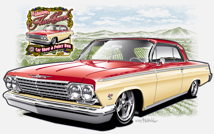 My rendition of Tim Kerrigan's '62 Impala, with an inset of the t-shirt design it's going on. For the record, I didn't do the background landscape art.