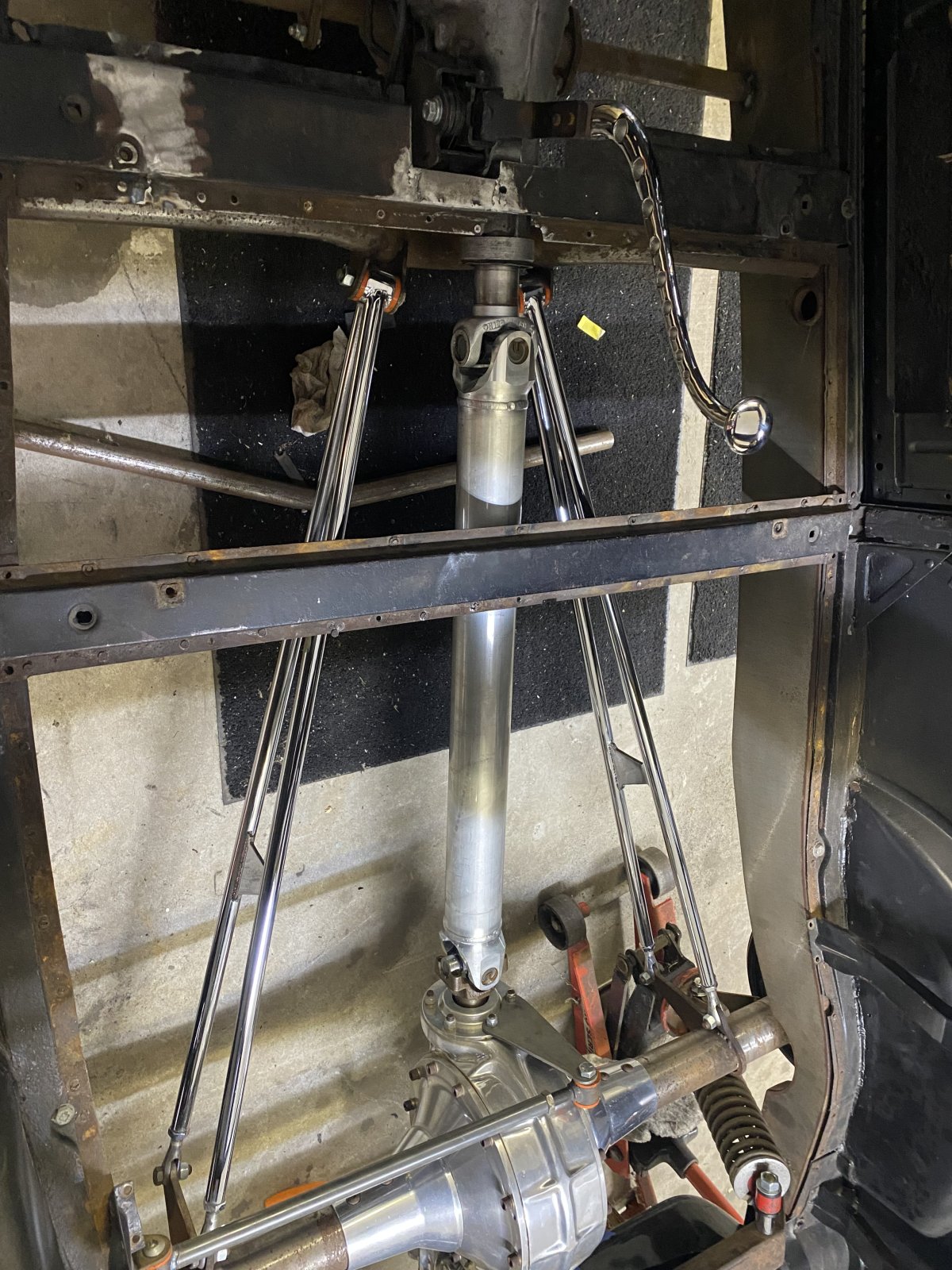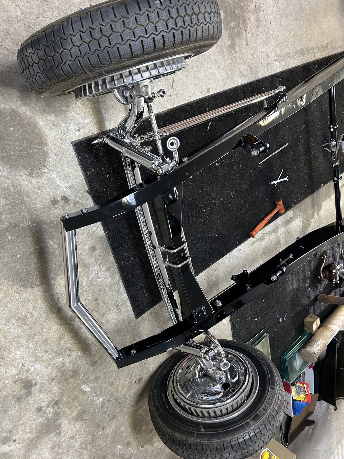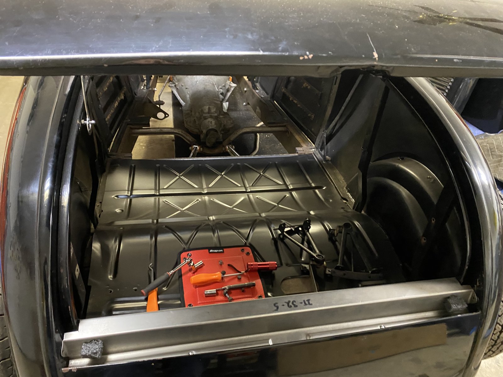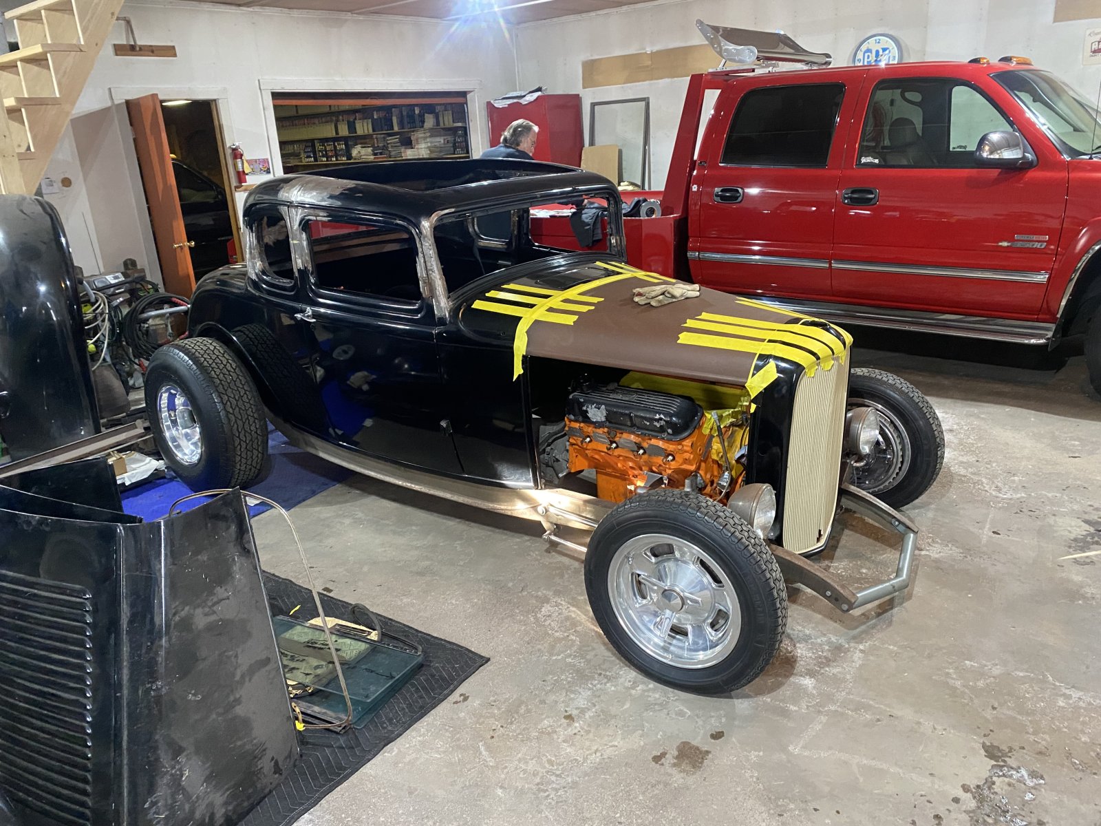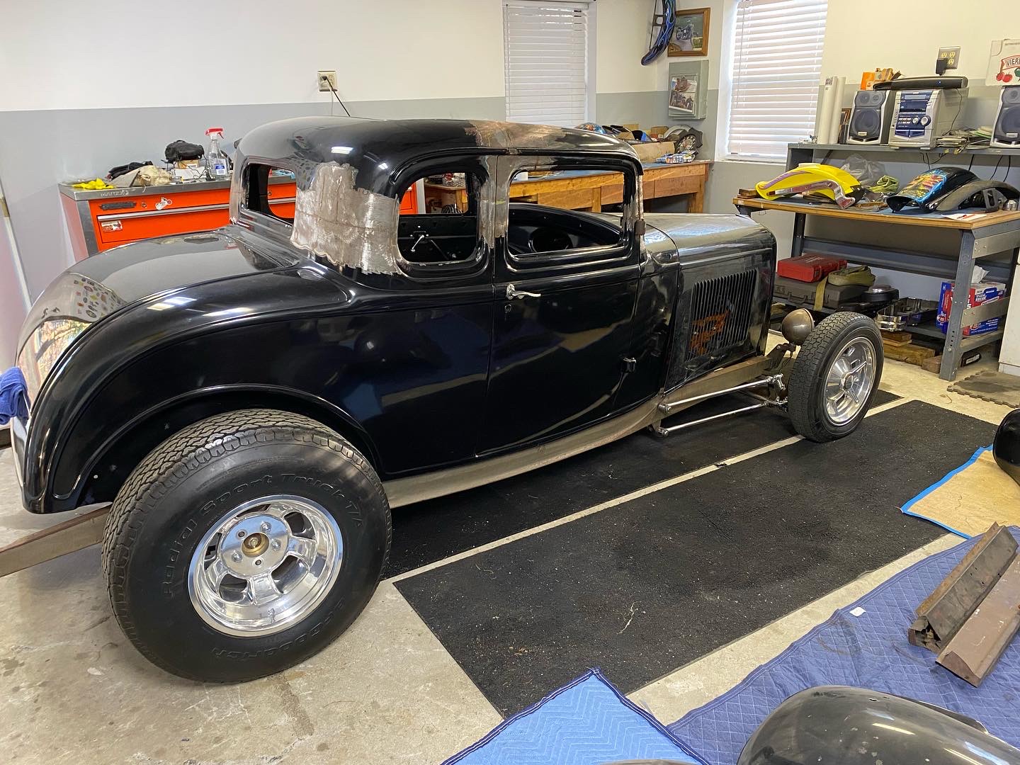 Here are some pics of the 32 5 window I have been working on over the last few months. I got the car in Michigan and it was a surprisingly nice rust free body. The car was painted black lacquer 40 years ago and never put back together. Shortly after it was painted the owner decided to chop it 2 5/8 inches. The car was put on a new aftermarket frame with a street rod 4 bar suspension and Halibrand quick change rear. At some point the floor and firewall were removed and used for another project. I brought the car home and decided I wanted to go with a more traditional style car. I removed the 4 bar and tube axle and went with a 4 inch drilled drop axle and stainless hairpins. The photos are the timeline of my progress.