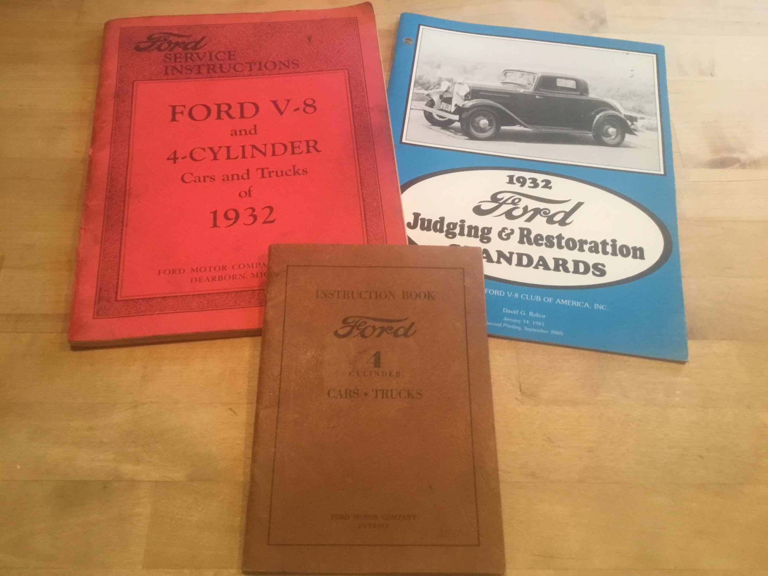 1932 restoration books 1 and 2, 32judging, 1932 v8and 4cyl service instruction along with glove book 4cyl cars and truck book. 75.00 with free shipping. These books are Gone. Thanks