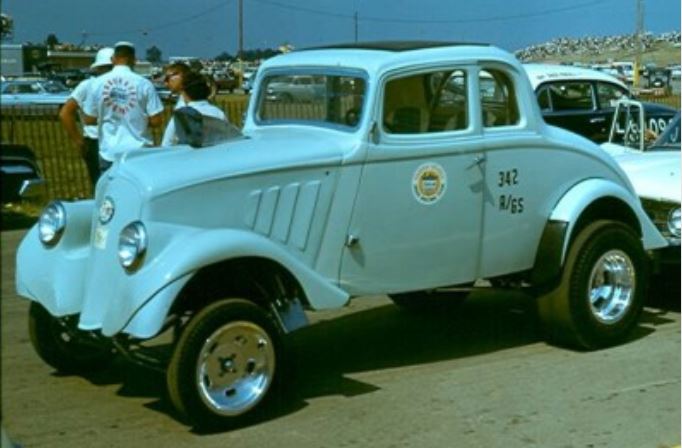 1965 NHRA Nationals Indianapolis. The Hurst Gasser Passer Anglia waits in the tech inspection line followed by Ohio George Montgomery's '33 Willys coupe.