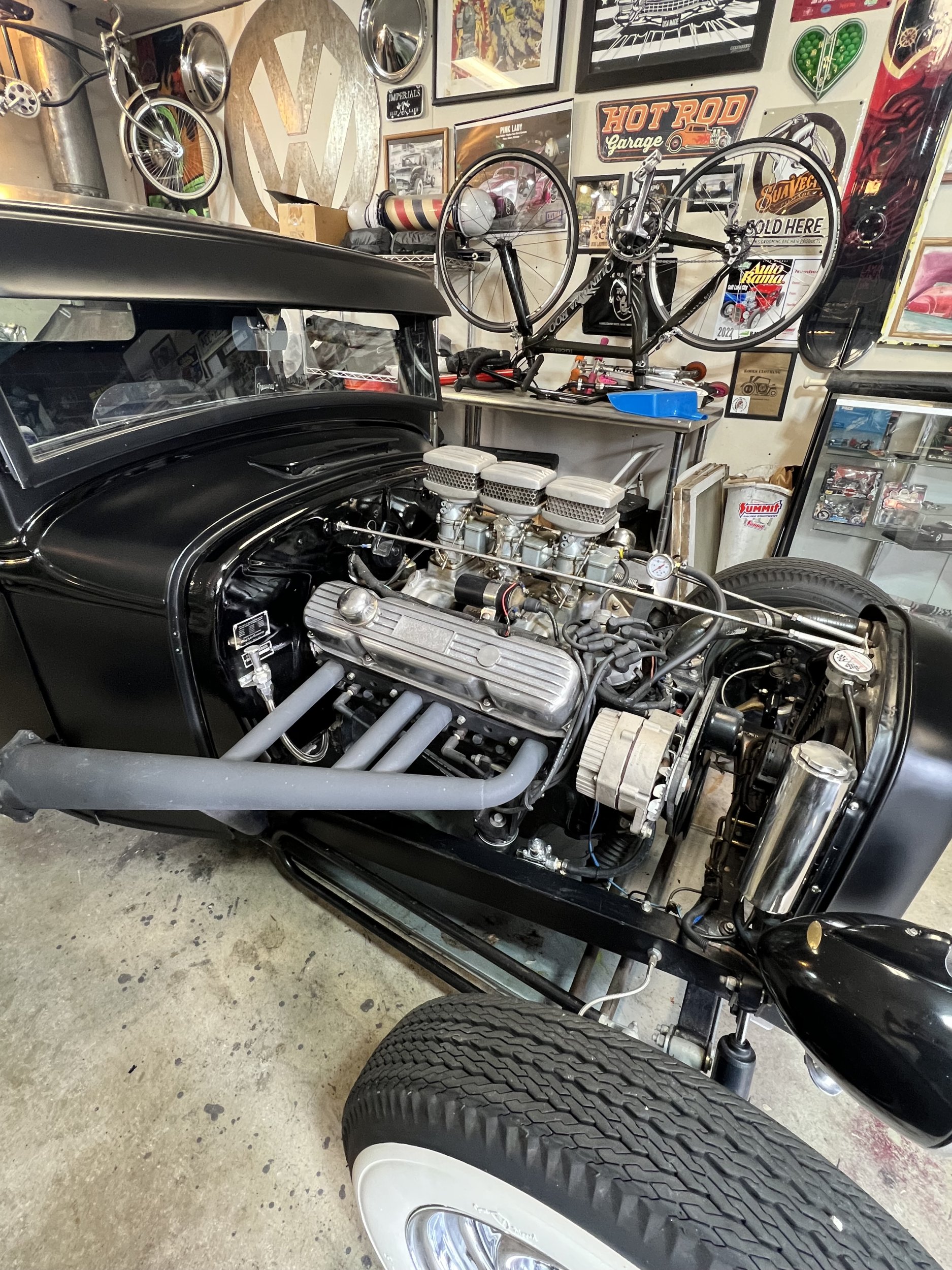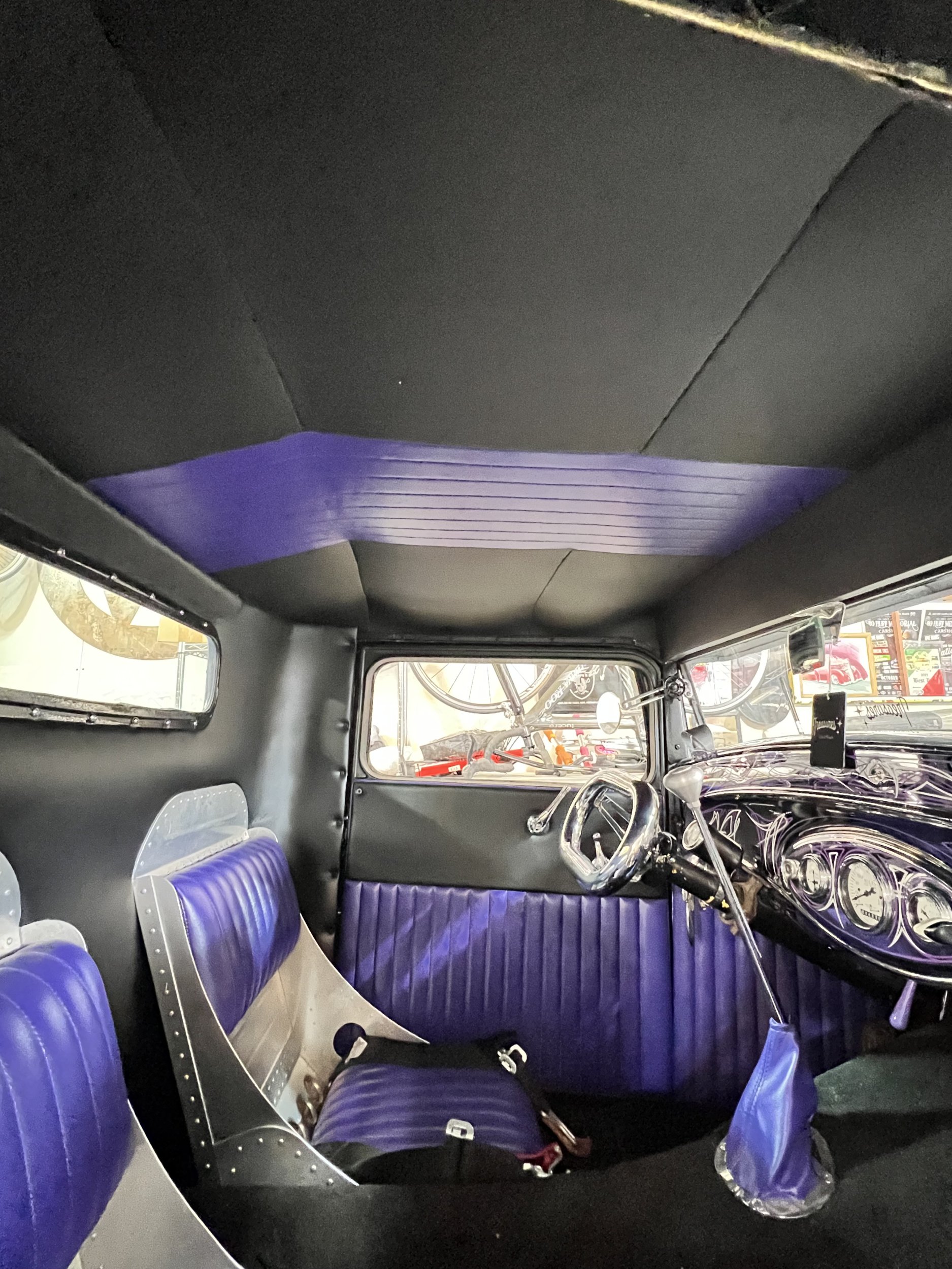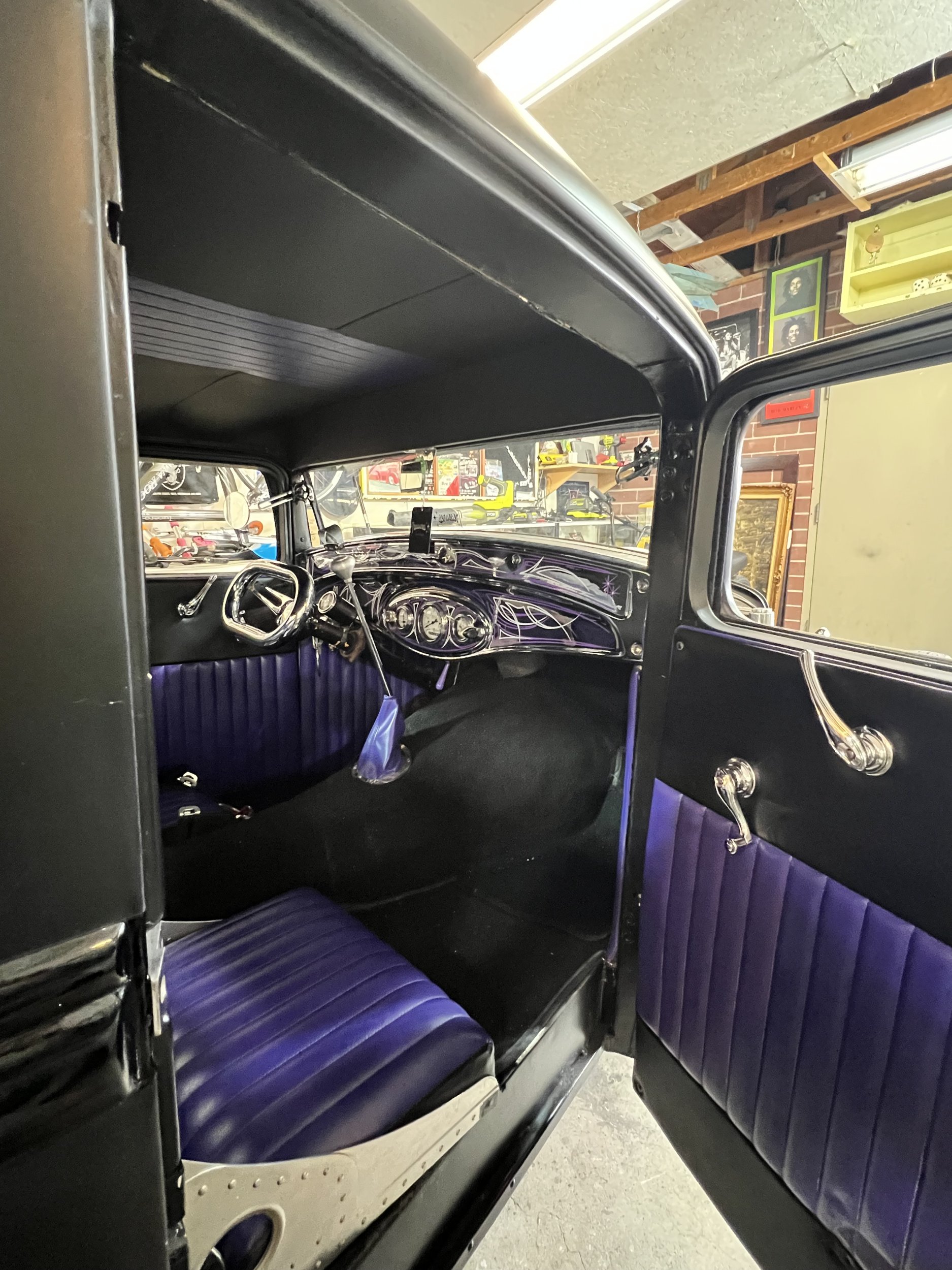 383 big block- 1966 dodge coronet drive train 1934 ford pickup. registered as a 1934 ford pickup Engine 383 big block mopar. 2500 miles on motor since rebuild. Super 97s tri power. comp cam. gear drive. Rear suspension: Transverse leaf out of 41 ford pickup. 4 link Mopar 8. 75 rearend with 3. 55 gears. locker Front suspension: beam front end with hairpins. Ford F1 front drums. vega steering box trans: 727 torque flight 15000 miles on rebuilt trans. shift kit. heavy duty clutches. and heavy duty torque convertor. deep sump pan. 18" heat sink cooler new glass Guide 682c headlights- all lights and turn signals work Chrome dash Genie shifter Cruzwell custom oval steering wheel Rare Crafty B air cleaners Lake headers with turnouts and baffles with exhaust To the rear Frame. Boling brothers early iron frame 5/10 sweep. satin black epoxy paint Chassis 100% tig welded Stewart warner gauges Lokar shifter Body chopped 5" channeled 4" bomber seats the chassis was 100% tig welded. not your typical bubble gum together "rat rod" Very clean! custom steelie chrome wheels made by TRUSPOKE Firestone big and littles- 15s up front, 16s in rear never over heats or goes past 190 degrees- electric fan on at 190 and off at 180 Super reliable turn key hot rod- ive driven to bonneville multiple time- never any problems- never driven on the salt either 2 tone black body , matte with gloss black body trim Interior is black with purple text with any questions anytime 323-839-1530 Located in salt lake city