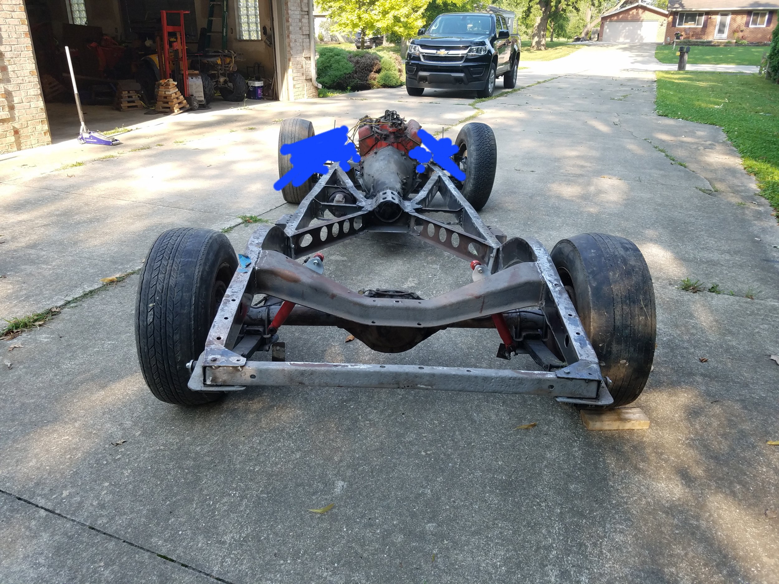 I did a hemi in one of our repro 40 frames years ago and did not have that kind of problem. Is the motor blown? Are you using a BBC waterpump? You shouldn't need to move it back that far unless it has a blower on it.