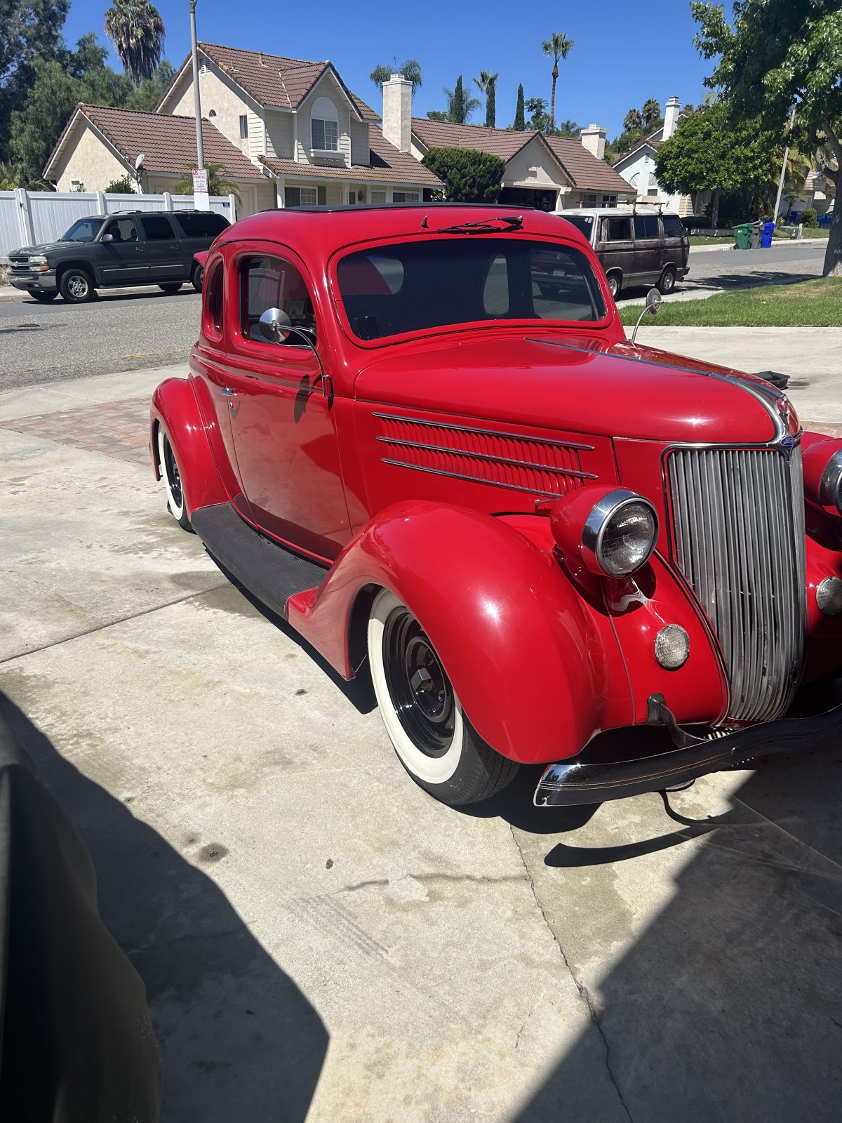 1936 ford 5 window coupe.Steel body with front and rear glass fenders.Sbc motor with 400 automatic transmission, nova rear end with original front suspension with disc brakes.New steel wheels with 640/15 Firestone white wall tires with tubes.New fuel tank with 4 link and air bags on the rear.4 link suspension done by Bellos customs.New exhaust from muffler to the back , also new shocks in the rear.Not a show car but a great start to a custom.NO TRADES. 36 K