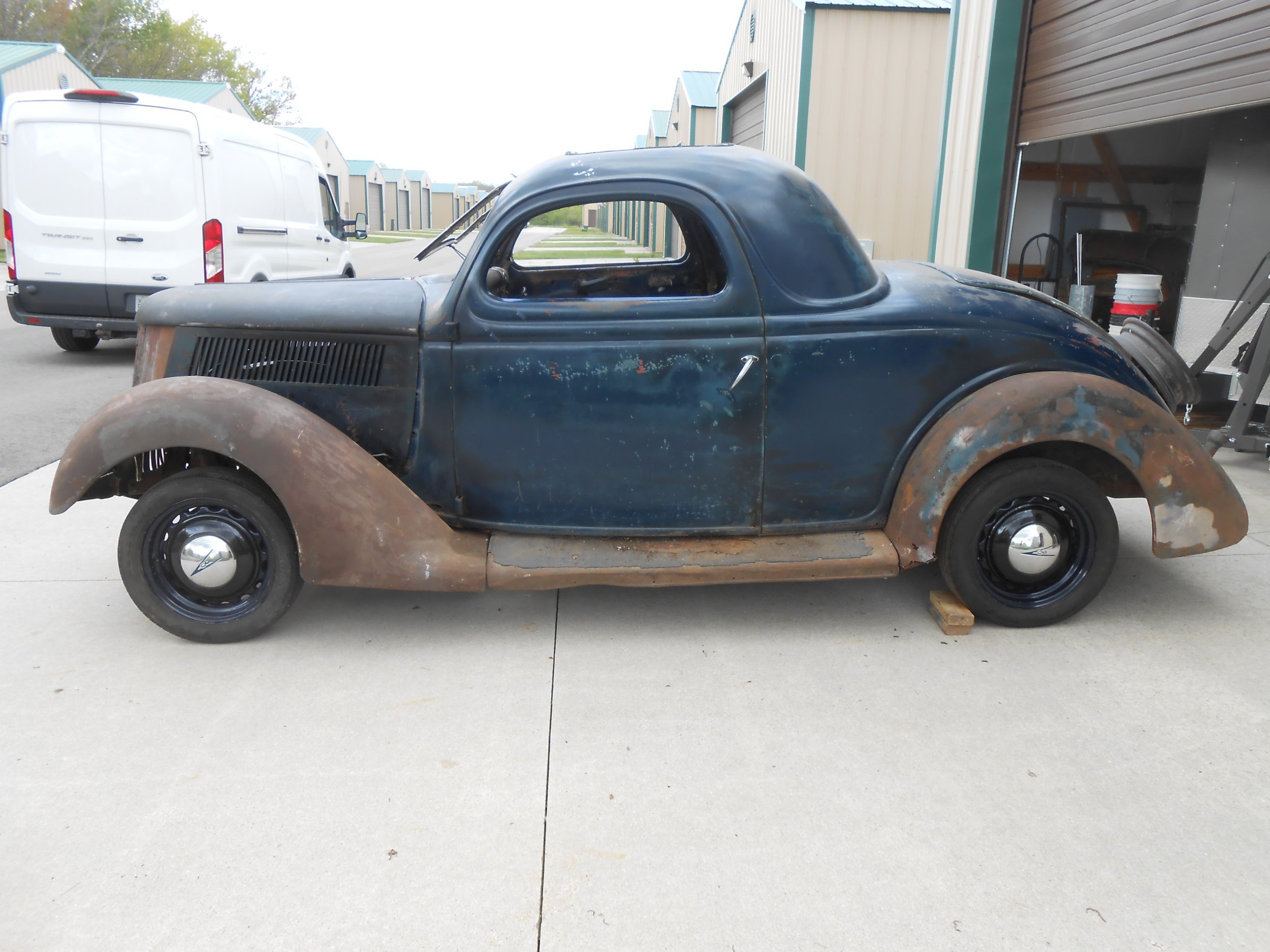 1936 Ford Three Window Coupe Steel Car Includes front fenders, front fender panels (horn covers), hood, grill Includes very nice windshield frame Includes window crank out mechanism, dash and window regulators Doors open and close beautifully-door latch mechanisms are included Includes deck lid-it will need inner steel restructuring Has a Good Wisconsin Title Will need a complete floor Will need Inside lower passenger side door inner panel There is no engine The transmission and original front and rear suspension are in it The tires and wheels in the picture are not included-they can be purchased separately If you would like to make this a 1935, I have all the sheet metal to do that-hood and grill—that can be purchased separately I have window mouldings that can be purchased separately-call me if interested Will sell body alone. Call for pricing CALL Brian at nine two zero three seven three two nine five three.