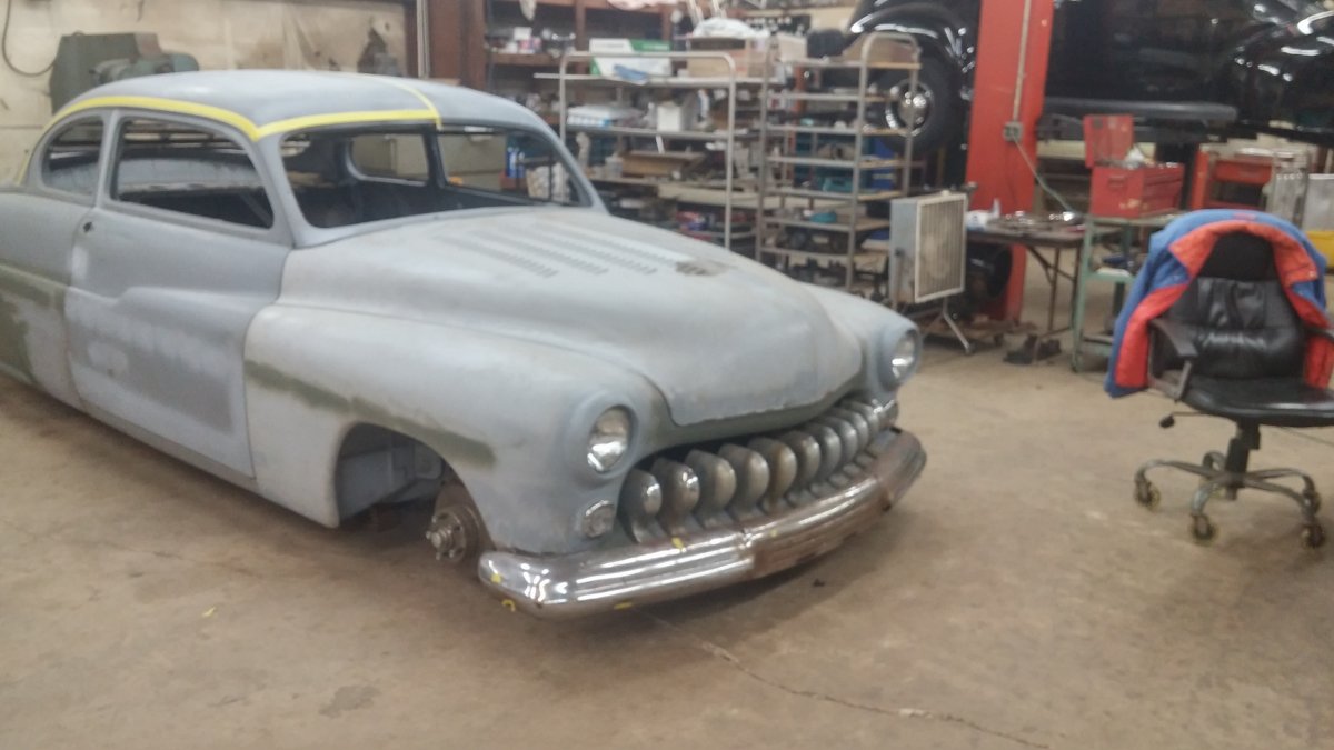 I don't actually have any pictures for whatever reason of when i did the headlight frenching or the turn signals. The headlights were just the generic 54 merc steel ring that you trim to fit, and for the most part was very simple just sand the aluminum housing for the headlights down so they fit flush from the backside. Now i love "steel round-base weld nuts" from mcmaster-carr instead of using clips or incapacitated nuts that's my go-to because you never have to worry about them spinning or breaking. So welding some of those in and before actually welding the rings on I made sure to rig up a quick headlight harness so I could turn them on to set the lights themselves. Simply measure how high the center of the bulb is on the car vs how high the center of the light beam is on the shop wall with the lights off once its the same (distance/height) your good to go mounting the frenching rings. The turn signal housings are one of those unobtanium piece that I ended up just making myself and welding into the car instead of being removable. Next was working on the hood, filling all the trim holes, rounding the front corners and actually make it have nice gaps . I'd previously gotten the back of the hood trimmed and fitting nice but the only problem was the hood didn't fit very well everywhere else it was centered but it just had horrible gaps. After trying every means of possible adjustment which there wasn't much to begin with I knew I'd have to actually do some more welding to get this task done right. Using a paint stick as my guide i basically starting by marking where is started to not fit and then saying by how much. I needed to do this because I end up welding various size plate from simple .030 sheetmetal to 1/4 in the worst spots. It likely didn't fit because when it was louvered (142 if i remember correctly) but after my fix it fit lovely and i had my nice uniform paint stick gap. After that i finished welding all the front together setting the gap at the front bottom of the hood. Also around this time i finished filling and replacing metal to fix my front valance... and what a thin holey nightmare that was.