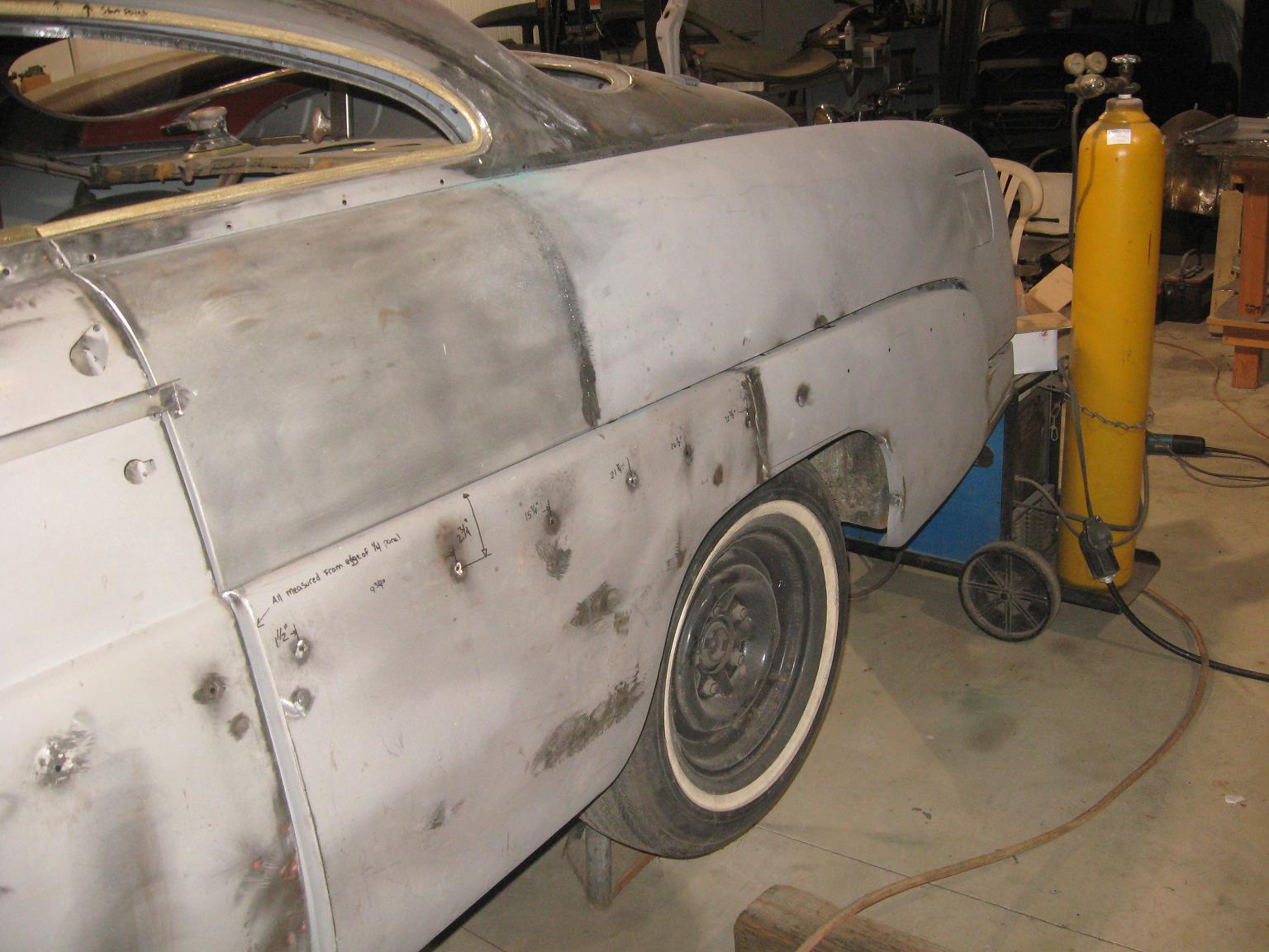 So after getting the chop all done and doing some miscellanious stuff, I get a call from the owner and were talking for a bit....Then he spits out...I think I might sell the car, I'm liking the look of 51's better!!! My jaw dropped!! Well after some more chit chat I brought up the idea of grafting some 51 quarters on instead of starting over thank god! I called my fellow Merc brother Chad (Ether), because I remember him recently dragging home a rust bucket 51 that he was going to part out. Ended up getting everything I needed pretty much to start the swap.