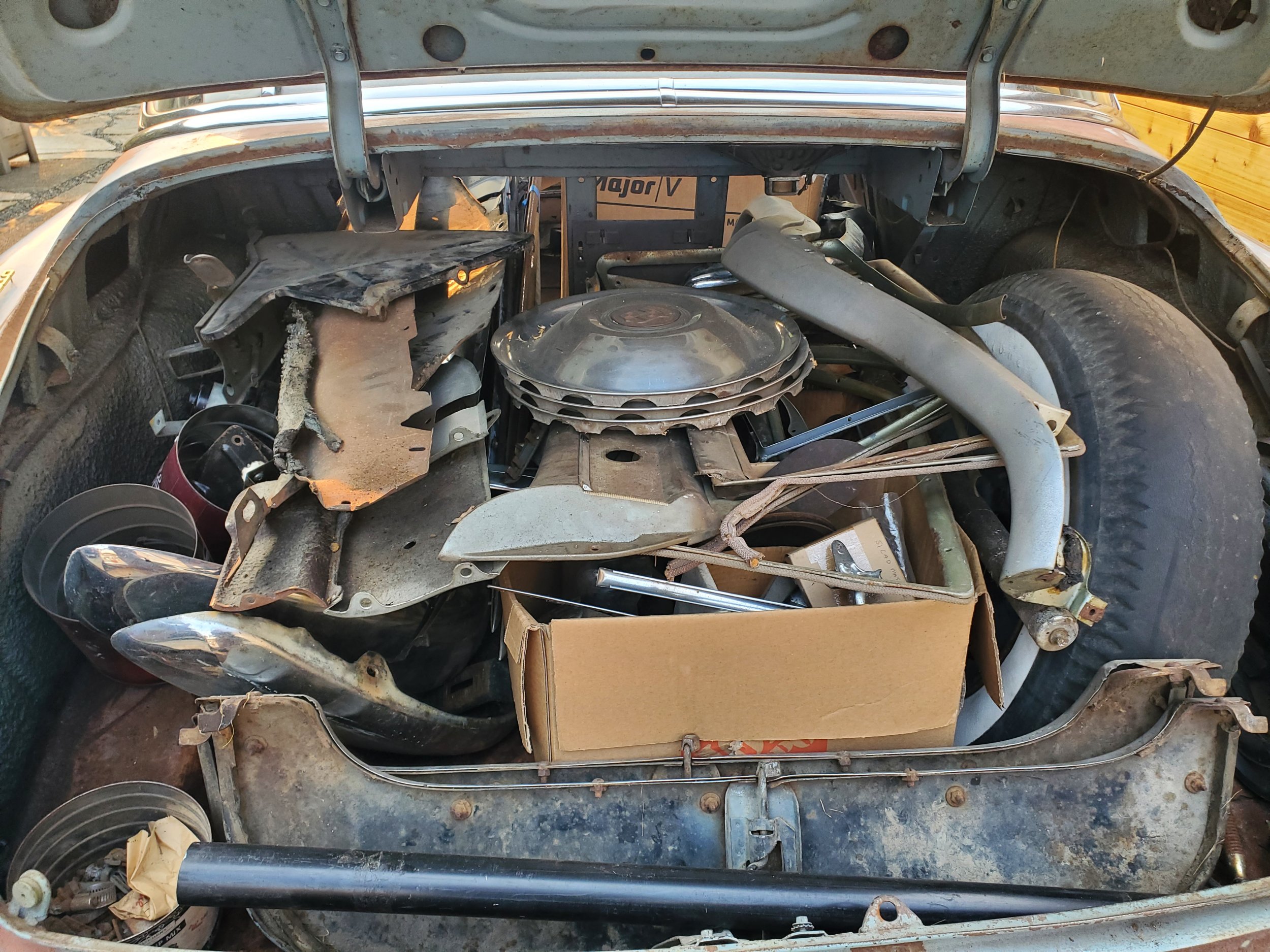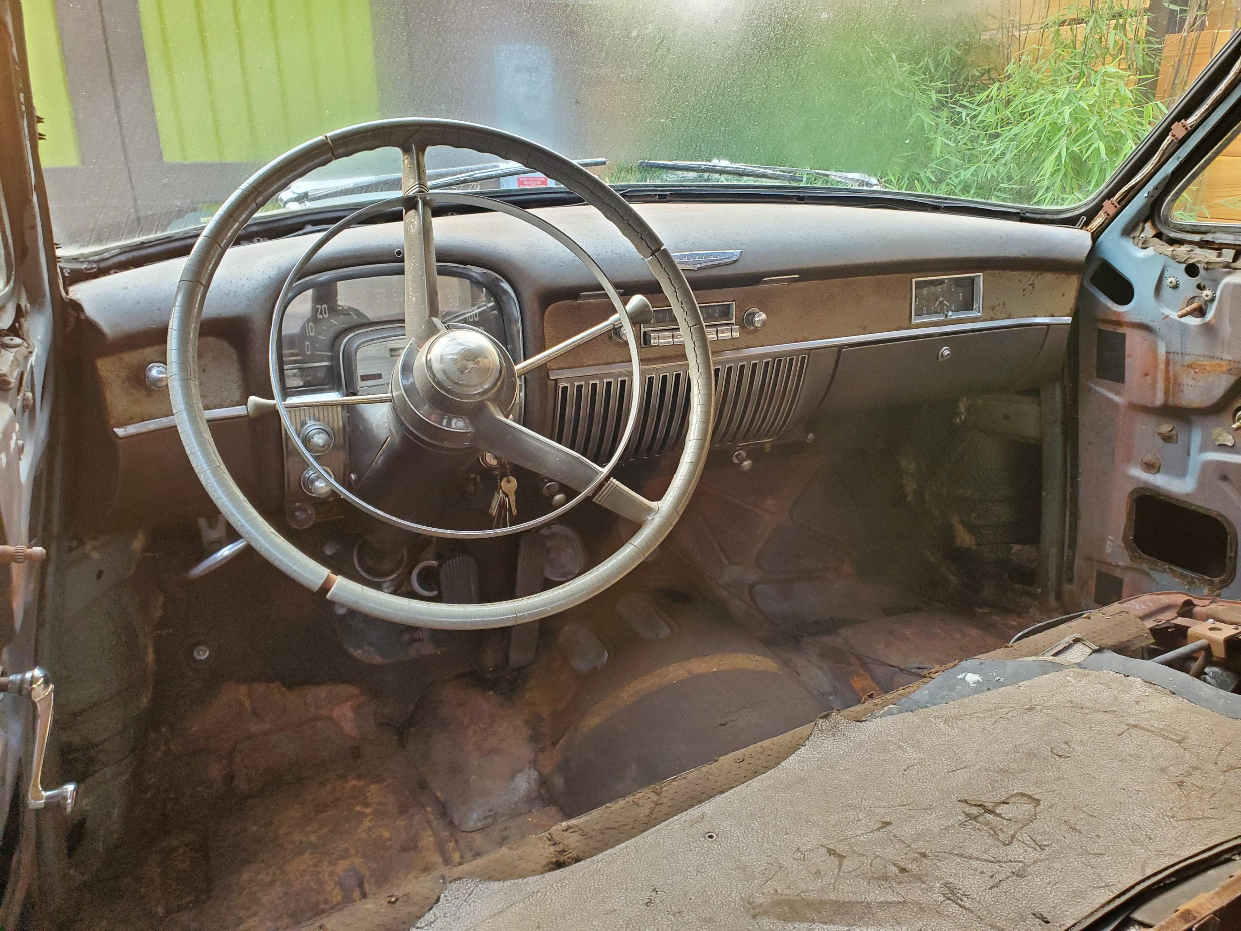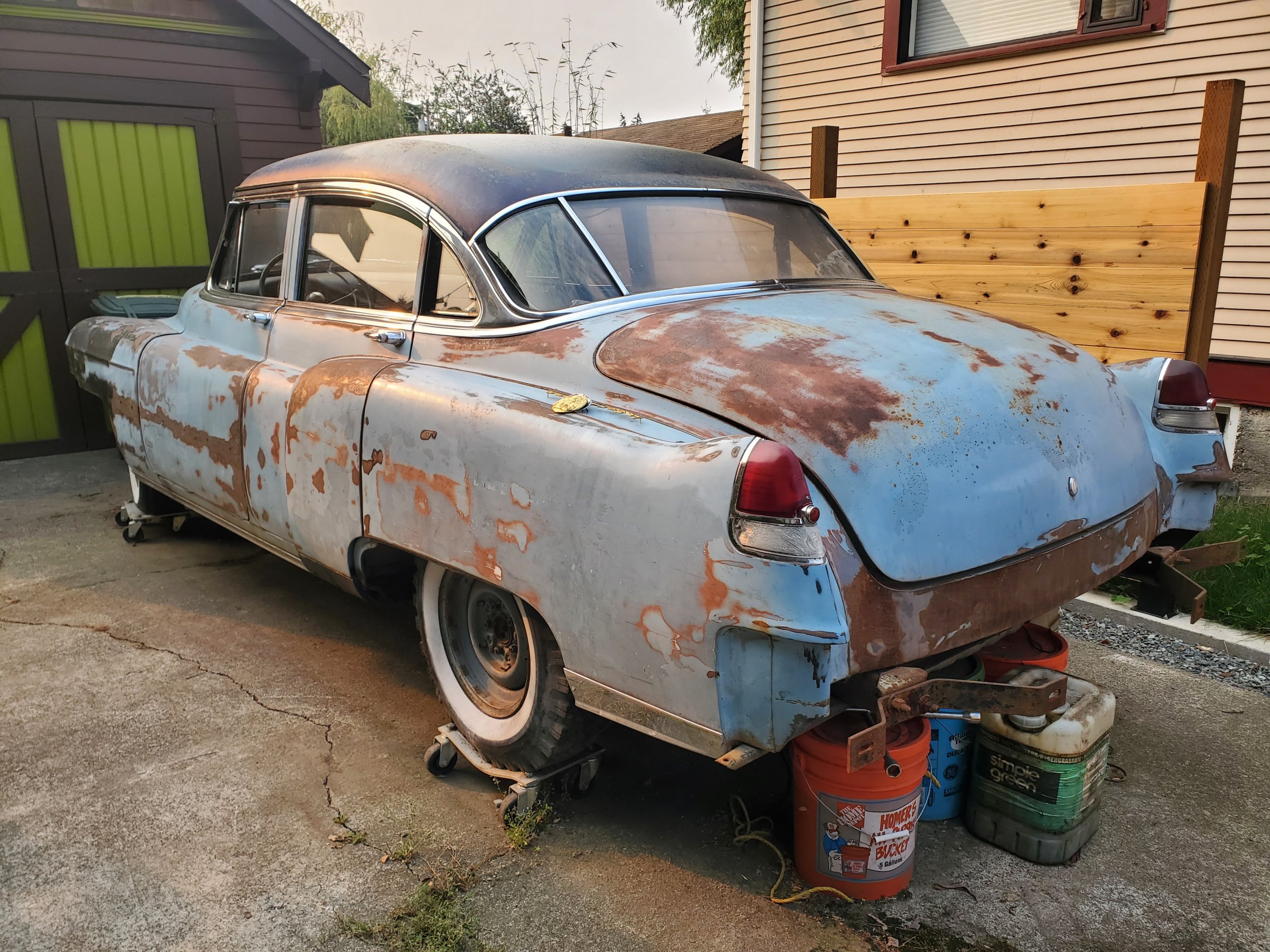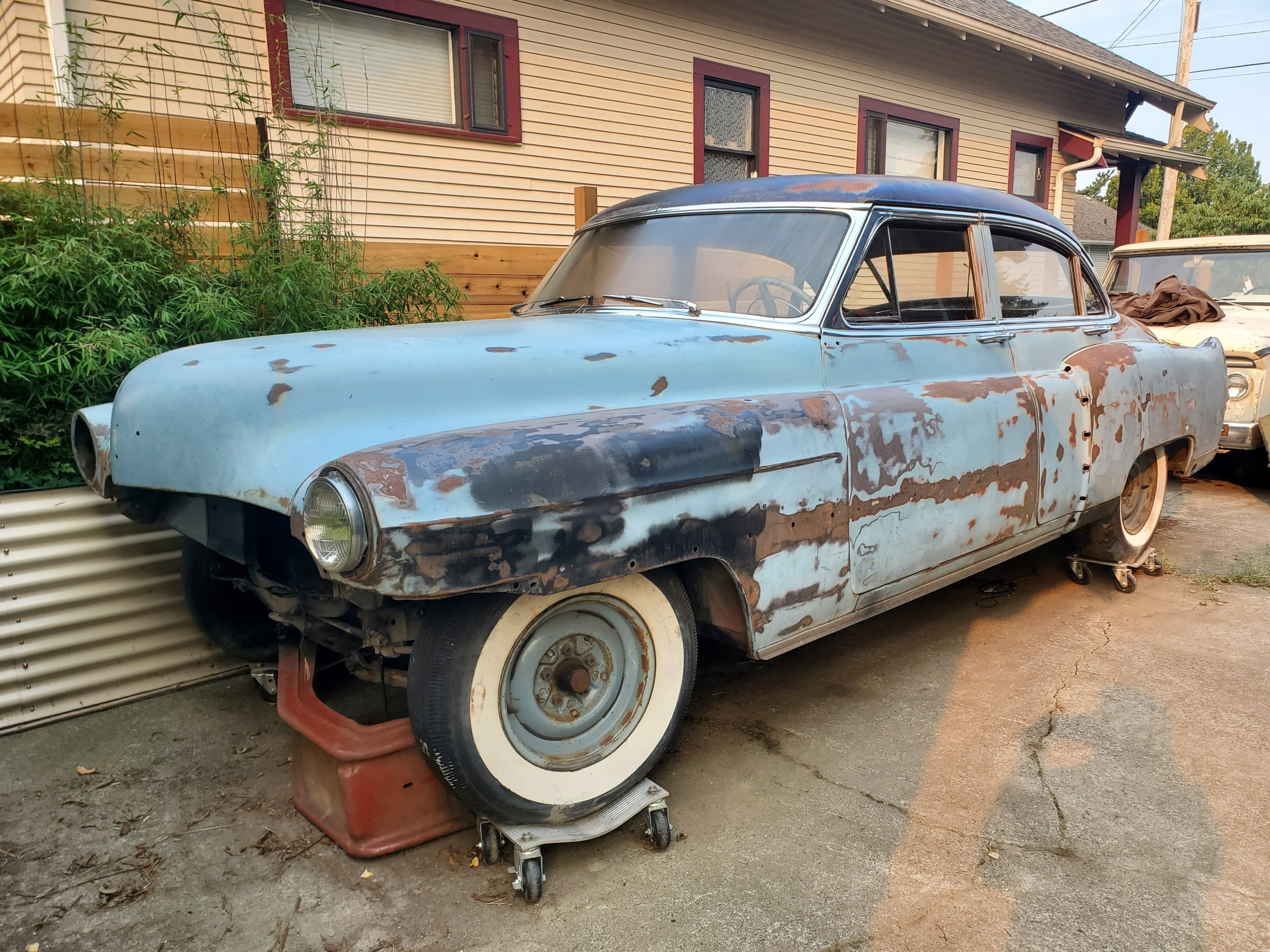 Selling my sled project, a 1951 series 62 sedan with a very clean, unmolested, free turning 331 2bbl ohv V8. 6 volt. Odometer reads 09042. Clean title in my name. I drove it around the previous owners property (sitting on a paint can) before purchase. It's missing some teeth on the ring gear but he included what looks like the correct replacement. Previous owner disassembled and sanded it a bunch for paint and had the bench seats and door panels reupholstered quite nicely if you like blue. They aren't 100% perfect after being stored but are very nice. He installed a fuel pump. It has a rebuilt water pump installed. I had the starter repaired but have done little else on it with the unresolved ring gear issue. I never did an inventory but the parts pile looks really complete. Hubcaps, trim, skirts, body clips, glass dome light, etc. Old whitewalls hold air and brakes are firm. Trans shifts into gear. Water has been drained as it sat. Body has several small rust spots but nothing terrible. Rear center window is plastic but the rest are original and work fine. He sandblasted the grill pieces. Bumpers are straight, but the rear is split at the weld like they apparently do. Steering and suspension are solid and original. Rear tires are killer Firestone whitewall truck treads that would make nice displays. Floor is really solid with the exception of a couple non-lethal trunk issues. I have a battery and if it's still good I hope to have it charged and in the car this weekend to work on getting it turned over. Bummed to sell this handbuilt Detroit car, but I have to focus on the cars I already have running. I'm in Bellingham, WA and the car will easily roll onto a trailer with functional brakes and steering.