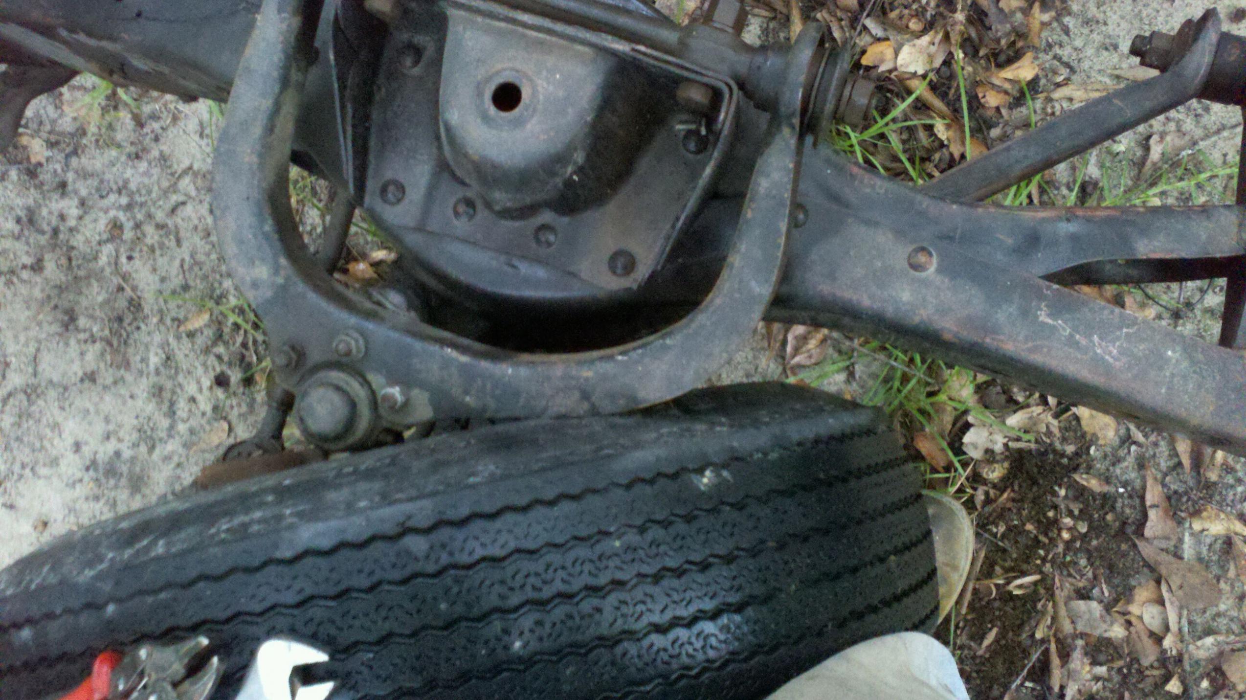 I got a little work done yesterday. I started sanding the roof...getting the rough body work done. I also started cleaning up the frame some. I removed all 4 of the rear bump stops, both exhaust hangers, and the brake and fuel lines. While working on the frame I noticed that my wheel rubs up against the A arm. I will need to trim the A arm down a little for clearance. The 1st picture is of the tire rubbing. 2nd pic is of the rearend..I hadnt notice that some one had wrote Go Daddy on it until I started working on the frame. pictures 4 and 5 are of the rough work on the roof. I hope to have the roof finished and in primer in the next couple of days.