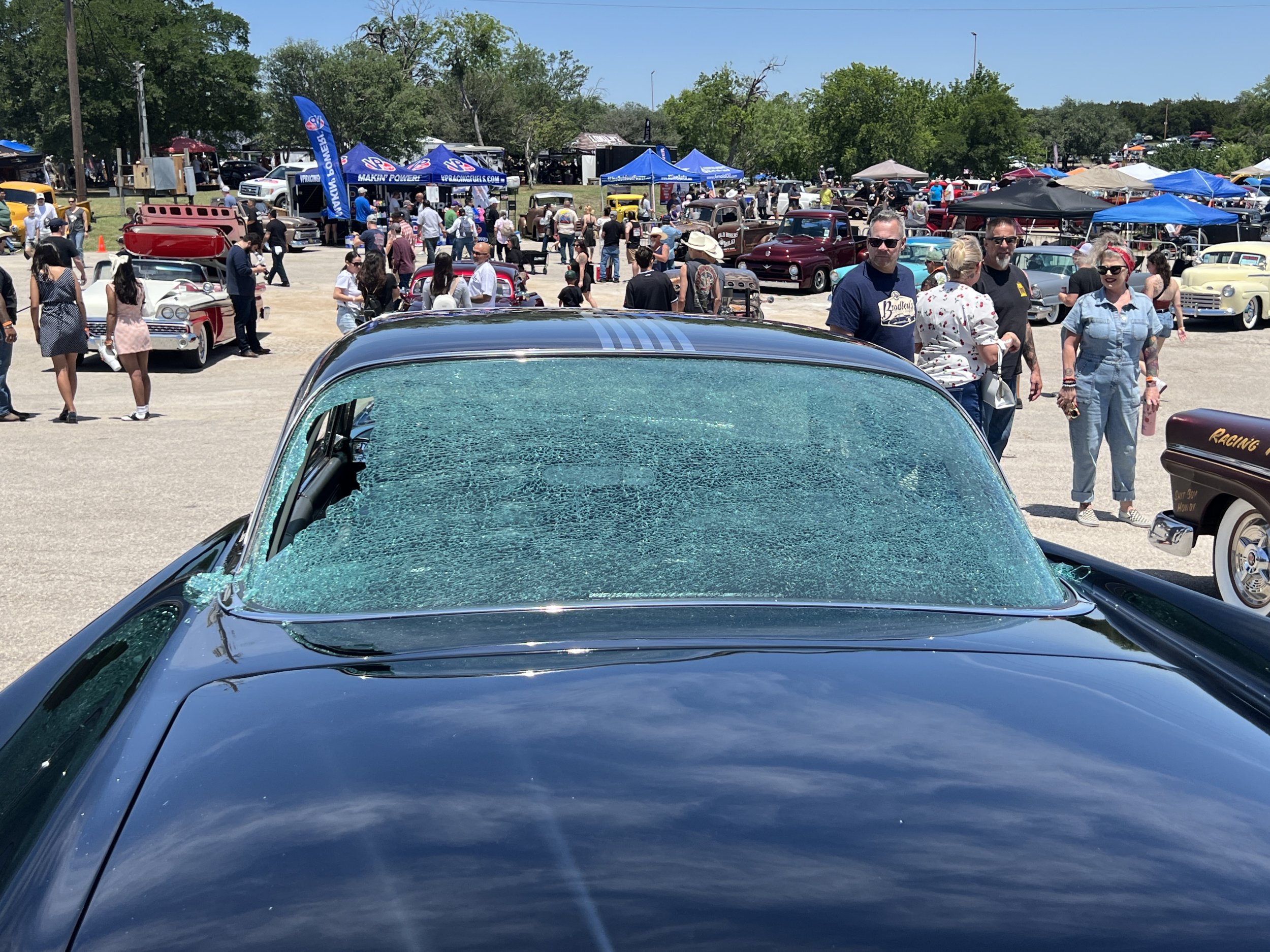 It's probably not the same thing that happened to your car, but in the late 1970's something happened in Columbia Missouri that broke many car glasses. The day was pretty miserably hot and a storm appeared in the western sky. I saw it coming so went out to the street and opened the windows and rear hatch of my car for a few minutes to let out that superheated air. Closed everything up and went back inside. The wind whipped up and the cold rain started pelting everything. When all was over there were many broken windshields and back glasses in Columbia. My car survived just fine. Sorry about your car and hope you can get a replacement glass without having to donate a kidney.