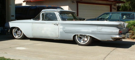Here's my old kind of beater 60 El Camino with your wheel and tire thoughts to help you see how they look. This one just dropped with cut springs: This 60 had a 307 and T350. I also had a 59 El Camino (notice this past tense on El Caminos) that had a 350 and 700R4. Traditional SBC works great in these, although you can fit just about anything. Here's my old 59, this one had dropped spindles and lesser cut springs.
