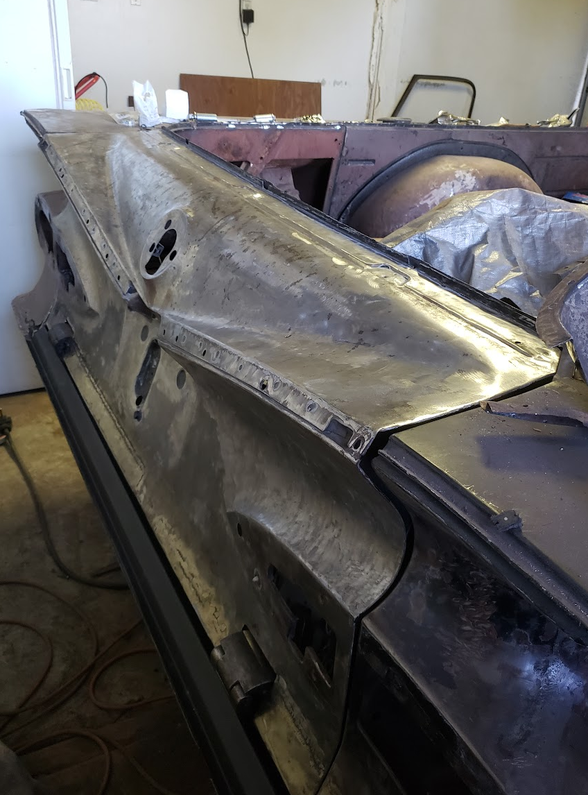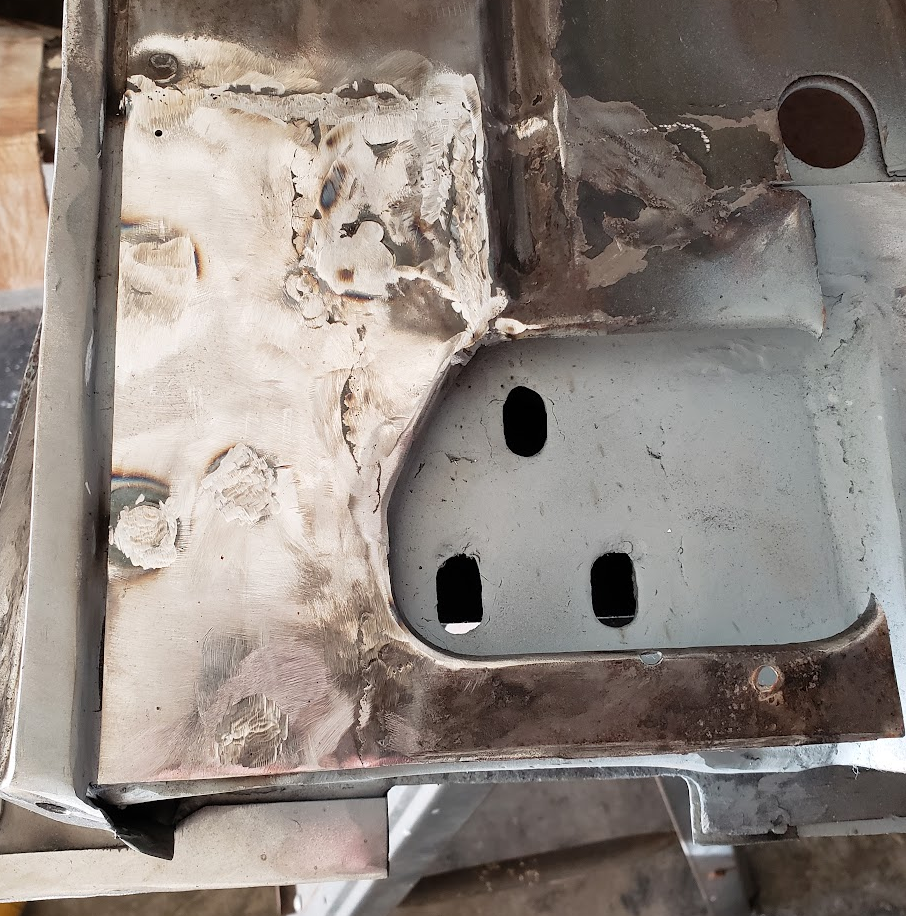 8/22/25: I’ve been wanting to get this written up for quite a long time but haven’t been able to. It will have been three years of work this past July, 7/11/2022. I’d like to preface by stating that I started this project with almost no knowledge of working on vehicles. With a mechanical engineering background, I knew the physics behind a lot of the automotive systems, but the intricate details of things like ignition, braking and fuel delivery systems took extensive work to learn as the project progressed. Unbeknownst to me at the time, the most important thing to learn was welding, which I had zero experience with. That will be evident soon. I intend to update this when significant enough progress is made, warranting a status report. One of the biggest reasons for holding off on writing this to begin with was knowing how much needed to be done. I don’t know how many times I’ve heard ‘long way to go’ when people check on the progress. While that’s still true, there’s quite a bit that has been done that I think is now worth sharing. I will note that the only times I have available to work on this is weekends and a few days after work, so progress is very slow. History: I’ve always found the most enjoyment in life from taking things apart and putting them back together. From mountain bikes to analog stereos, whatever was intriguing that I could afford, I’d look to pick something up used and renew it to keep it going. In college I started to really want to get a vehicle with the intent to learn it top to bottom and get it back on the road, a really quality repair that I’d be able to maintain over a lifetime. Only a few vehicles really stand out to me, and once I came across the 59 El Camino I was dead set on finding one. After over a year of scouring I finally came across one that appeared complete, despite having some owner modifications that would clearly need to be reverted. Over this time, research made it abundantly clear how flexible and forgiving these old American cars are, Chevrolet in particular. Given the 59 shares the X-frame with up to the 64 model year, it only further confirmed this was the way to go. The goal was to make something that appeared factory original, but had quality of life improvements to the engine, transmission, brakes and suspension, mainly removing sloppy steering and less than ideal fuel economy due to inefficient gearing. Something reliable and comfortable that could easily be maintained, all without serious modifications. 7/2022: I drove out to Las Vegas from San Diego in a U-Haul van and trailer. My dad grew up dealing with old Chevys and Buicks so he had an interest in coming along. Checked the vehicle over and found rough patch work in a few areas (primarily the front of the rear quarter), but otherwise no real issues. Lacked a battery, exhaust and front windshield but all things that can readily be acquired. First rookie mistake was not checking the inner pinch weld behind the rear quarter or crawling underneath to check the undercarriage. The entire floor pan had been replaced with a reproduction panel, and a ‘rebuilt’ SBC 350 was installed. Had hydraulic control arms and springs, but on first glance all potential issues were (in my head) easily correctable. Absolutely packed with boxes of bolts, electrical components, trim, etc. A lot of very good chrome, and no dents. Looked good enough! Drove it home. I had COVID this entire trip, made getting back at 2am pretty tough. After recovering, the vehicle was cinched down into the garage and mounted on jack stands. Wheels came off and boxes were unloaded to a storage unit. Only picture I've got with the vehicle on the ground 8/2022: Due to having no money, I held back on any serious work and instead started on cheap, simple things to still be able to complete. So I started on the gauge cluster. All but the original clock had been swapped to digital gauges, which I opted to revert. I found some cheap original gauges online and broke down the speedometer. I cleaned the faces, reset the odometer to 0mi, and cleaned the corrosion off of the internal magnet driving the needle. Lubricated the gears and put it back together. The clock is a fascinating device that took quite a while to understand, but eventually I was able to clean all residue off of it and relubricate it. Testing it with a 12V battery confirmed it was able to start up and keep running. The fuel and coolant gauges were relatively simple, only needing corrosion cleaned off of the wire traces, then tested with 12V (+float for fuel gauge) to make sure they functioned properly. New lenses were installed and the gauges were all put back in their housings. Original clock mechanism 3/2023: There was a gap here as time was spent on getting some money saved up, gauges were being restored and just generally poking around to see where to start. This was the first real hurdle. To preface, to accommodate the hydraulics, the frame had been almost entirely wrapped in 3/16” steel plate. I was indifferent to this initially, but after checking underneath, wherever there wasn’t reinforced plate, there would be at least one rot hole somewhere in the original metal. Additionally, due to the modification to the frame for the hydraulic pistons, stock control arms were no longer able to be mounted. This made it pretty clear that I needed to swap the frame. I was able to find a great deal on a stock, solid 59 frame that I wire brushed and painted. I pulled the engine, removed the control arms and jacked the body up off the frame as high as possible. The frame was them pulled from the jack stands and dropped onto a piece of cardboard, that was then slid out from underneath the body. The new frame was then put on the cardboard and slid under the body. Bolted everything back up and mounted the engine back on the frame. The rear brakes were redone with new wheel cylinders, shoes and hardware. Replacement frame Body and engine mounted up 5/20