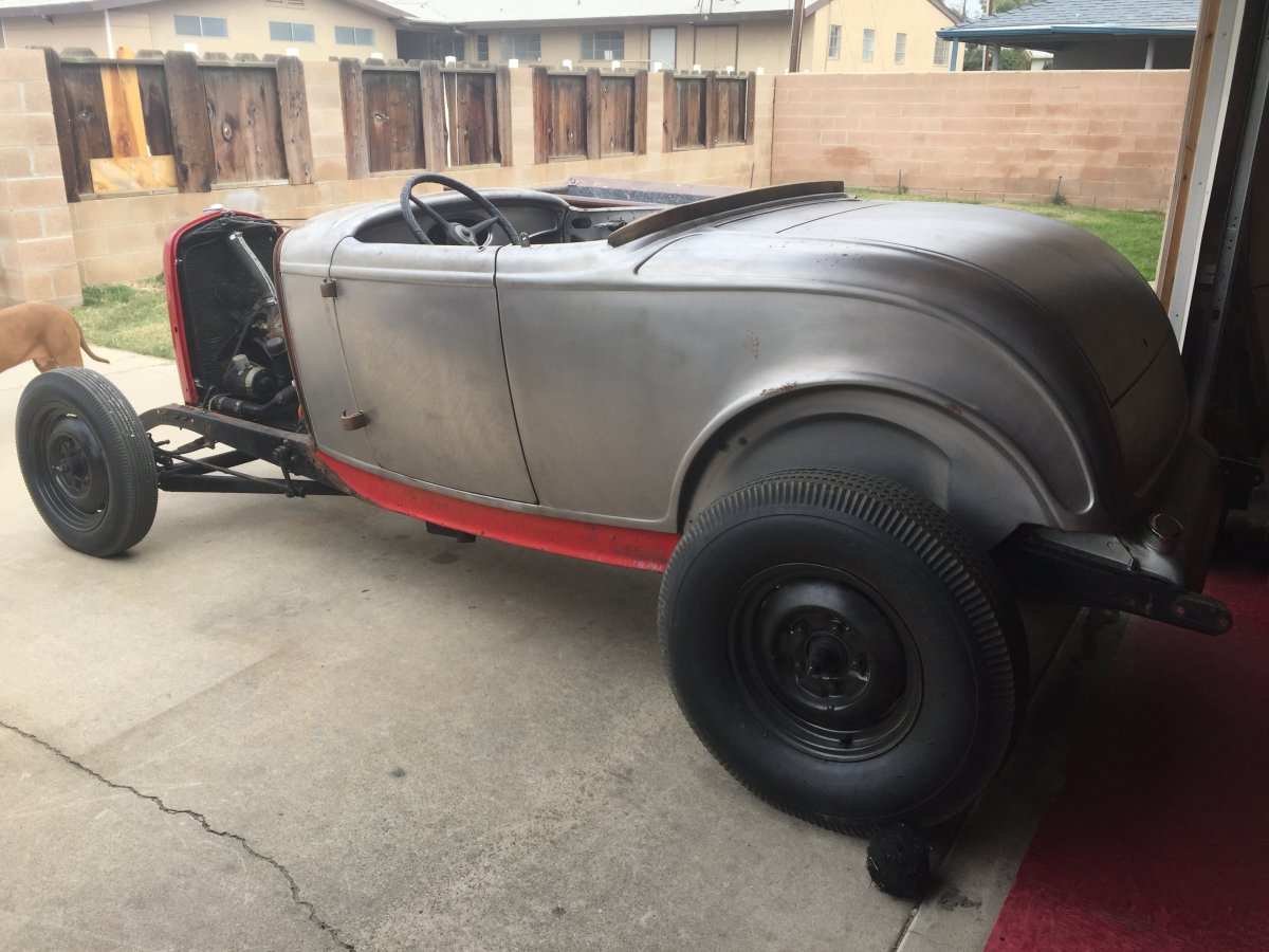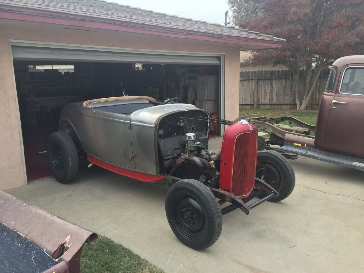 A little over a year ago I bought a Duvall windshield that I had been watching here on the HAMB for almost a year. Finally I made the owner an offer and the next thing you know, I'm building a car around the windshield( all this makes very good sense to many of us here on the HAMB, right...). I advertised here on the HAMB wanted section thatI was looking for a Wescott Deuce Rdstr body when I got a call from a local HAMBER that tells me he has a Deuce body for sale, but not a Wescott, but a Brookville steel body. Turns out we know each other, but had not bumped into each other for 32 years ! Funny when you don't see somebody for 32 years , and it's kind of an eye opener as to how old we look when you see the other person. You see yourself age slowly over that same span, but the reality is we are both a couple of "old, gray haired hot rodders" today. Anyway we made a deal for the body and the real project was begun. I bought a chassis from a good friend of mine I had put together for him about 5 years ago. Original rails that I put a Deuce Frame Co ( Carl Fjastad )center cross member in with a repro Model A frt and an original Deuce rear ( which I'll be re-moving and replace with a original Model A). I bought a So-Cal dropped axle and have it mounted to the chassis with 34 Ford wishbones using bungs I bought from HAMBER CTaulbert (beautifully made parts, BTW). Decided to give it the "old school look", but with a blown 471 blown , 1962 327 Chevy with a Muncie 4spd and 9 inch ford. The rear end is held in place with a pr of 36 rear bones. I'll be running 56 F100 brakes on the front with drum brakes in the rear. Hoping to be out in this by the end of next season, but if it doe not happen, it won't be the end of the world. I enjoy the build as much as I like driving them. Been a good year.