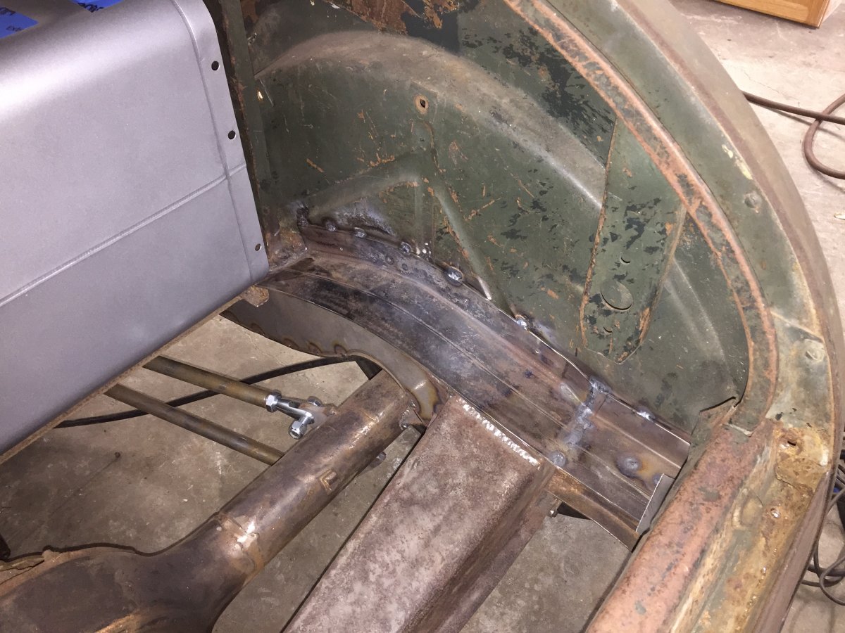 Alright after doing those I beam spring hangers some wheel well clearance was needed. Had to move the middle and rear bead up for starters. Once that was fitting nice, got it all welded up. Got the seat buttoned up and made a release lever from the 47 column shifter. Next up was to get the gas tank mounted. Firewall under way, still need to make the side pieces to seal her up. Then onto the column drop. I just welded a sleeve inside the stock model A clamp to fit the F100 tube. Then 3/8" flat bar glued on and ground to shape. Front floor board/tunnel is next on the list.