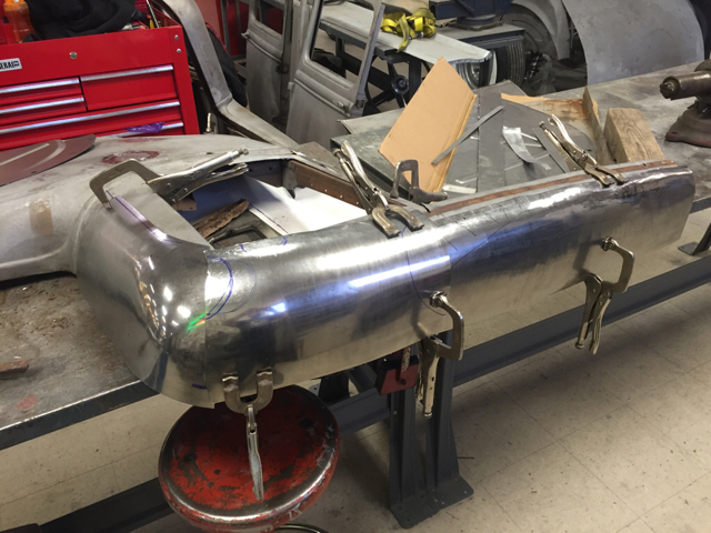 I spent the day working on my rear lower corner piece. I started by making some patterns. I tried making it out of one piece but couldn't get it through the bead roller. I ended up cutting it into 3 pieces. It took a lot of shrinking on the pullmax to get the right shape. It sucked to have to cut it but it made everything a lot easier.