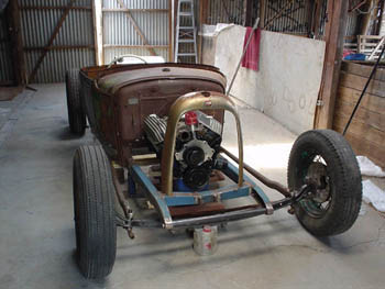heres how the pick up looks now,doesnt seem like a lot of change, but theres a lot of decisions made, about proportions,cab length etc. the motor is a '67 289W,pretty much stock,will build a three carb manifold out of the stock 2barrel alloy one.Bones will be shorter and attach just in front of cowl.next job is engine mounts and trans crossmember/pedal mount, then fab up the rear end (4 bar with A spring) I love my overland grille shell. any oz guys gotta 31" wide front spring gathering dust?