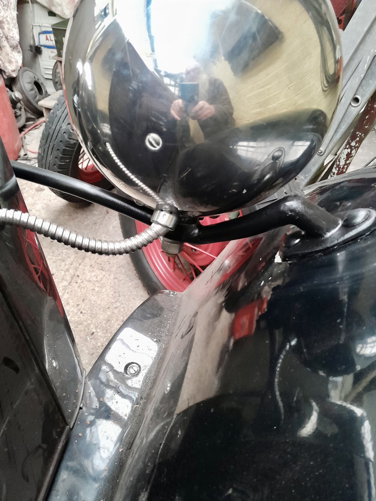 Got a few small things done. As a kid watching American movies, I was fascinated by how their cars would just start up without the driver taking their hands off the wheel. Even with open cars and Jeeps there seemed to be no driver input, like magic! It was some time before I found out about foot starter buttons, we didn't have them here, I thought it was so cool! Strangely the starter button had been extended to up under the dash, with a wooden cupboard handle on it, now that really did have to go! I turned up a foot button and shortened the rod which put back no end of cool, it still looks a bit billet but rattle can black will cure that. Also that blinging repro Quail has flown at last and a proper rad cap installed. There is a miss match between the radiator top tank and the shell, not sure why but I had to turn about 3/8" of the cap skirt to get it to fit. Fixed the quail fixing screws damage where the cap fits, so now got a snug fit low profile cap to go with the dropped lights. Made one good hinge mirror out of two, which worked out ok, dunno what to do about the other one as it's really ugly and I can't get it off, pin won't budge at all. Can't finish the brakes, still waiting for the master cylinder.
