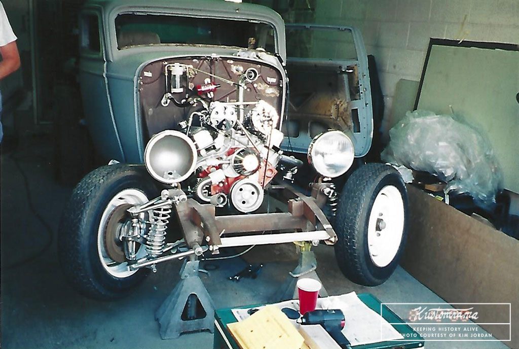 This is a good example of what happened to the majority of these old bitchen channeled 32 3 windows and other cool hot rods.... people changed and updated them and they're still here in plain sight its just they look lame now... LAME. haha- VIEWER DISCRESSION IS ADVISED! Example of the above car Copied from Kustomrama- Only the body, grille shell and rear nerf bar still existed from Conrad's creation when Kim went to check it out in 2000. Dudley had gotten rid of the Chrysler Hemi and replaced it with a 327 Chevy smallblock. "His reasoning was the lack of speed parts available for the Hemi. Dudley unchanneled the body filled the roof and placed it on a reproduction frame with a Kugel independent front end, 327 Chevy w/ Turbo 350, and a Maverick rear. A machinist friend was making billet parts to accent the coupe." Photo courtesy of Kim Jordan.