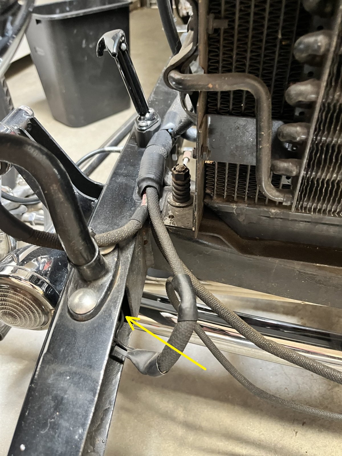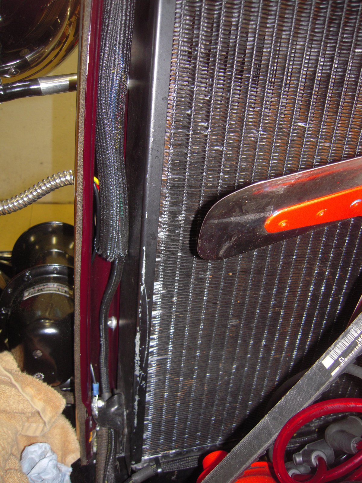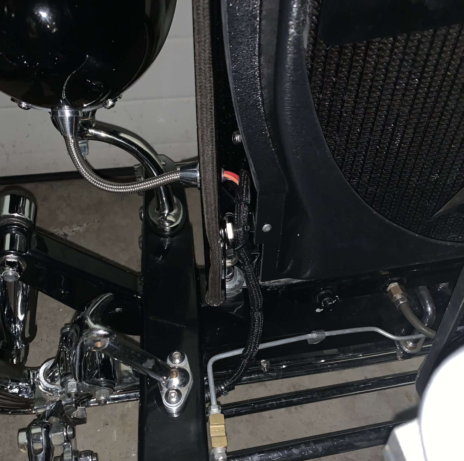 I'd open up two decent sized holes through the boxing plate to improve access. Put in a pull wire through each hole for the inevitable future wiring additions. Pics of my full fendered roadster where I ran the wiring behind the radiator and up the sides. On the bottom I used a couple of zip ties through the radiator core.