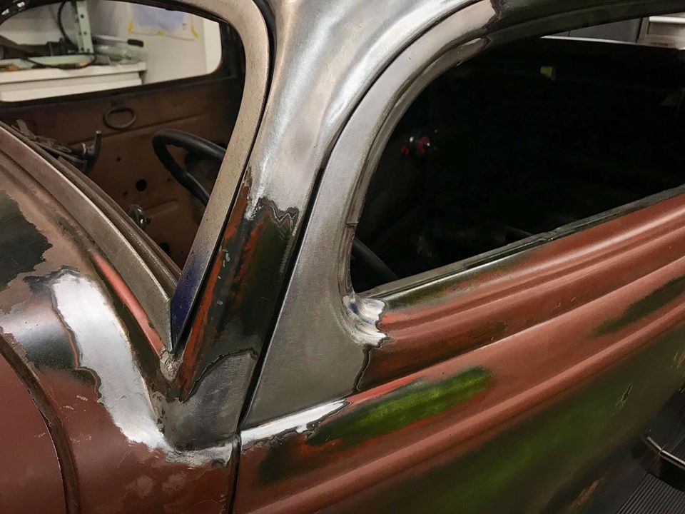 I've been pretty busy lately, so I haven't had a ton of time to work on the car. I'm still plugging away on the chop, mainly on the drivers side before moving over to the passenger side. When the a-pillars laid back, with a section removed from the chop, a gap opened up between the door top and pillar. In addition, the details/stampings on the jamb side of the door inner no longer lined up, so everything needed some massaging to look factory. I wanted to cleanly fix this, and I decided to remove the outer skin in the area. This allowed me to get access for reshaping the jamb side of the inner, and also allowed a clean way to extended the inner: Once that was welded and finished, I made a new outer skin from 18 gauge, and rough cut it to fit the new door opening. The new outer was welded and finished, and then I ground both the inner and outer to a consistent door gap. From there, I made a new hem for the back side based on the new shape. I clamped it in place, and welded the edge of the door to formally join it: With the door edge welded, I took a file to the edge to dress the welds, and cut a consistent radius on the edge of the door to match the factory profile: