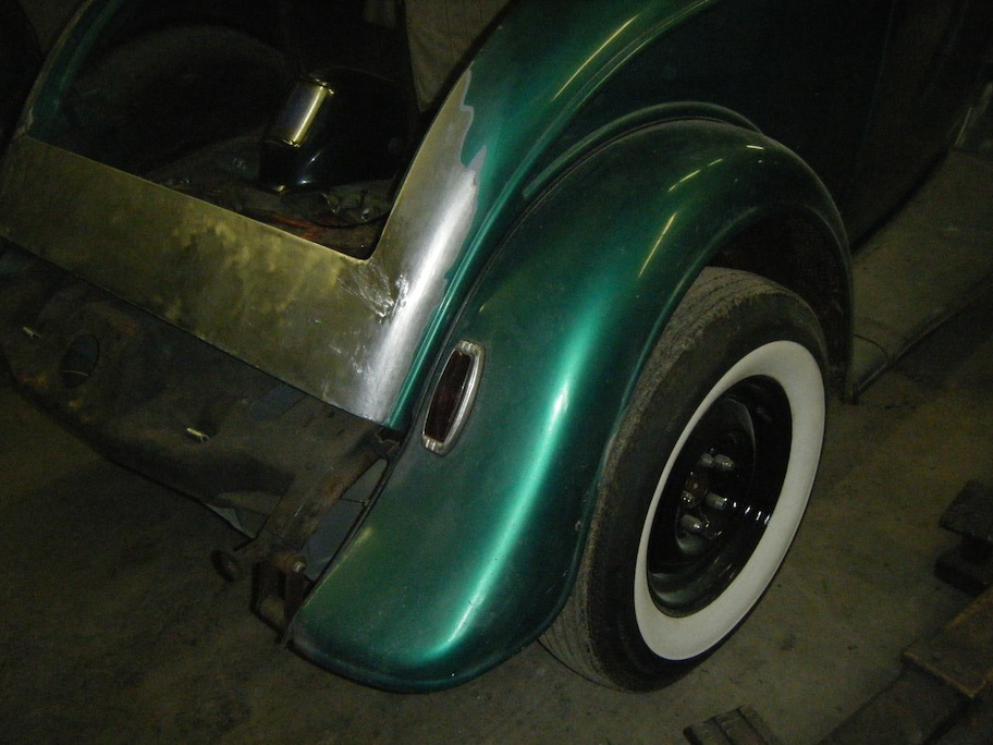 since i would have to cut the back of the car apart to fasten a replica piece of wood in, it was better to use a piece of steel tubing. this would allow me tie the metal hinge braces, the steel angles that connect the quarter panel and the body mount together.