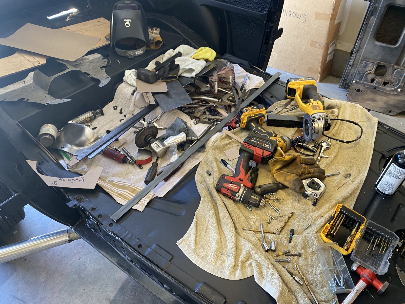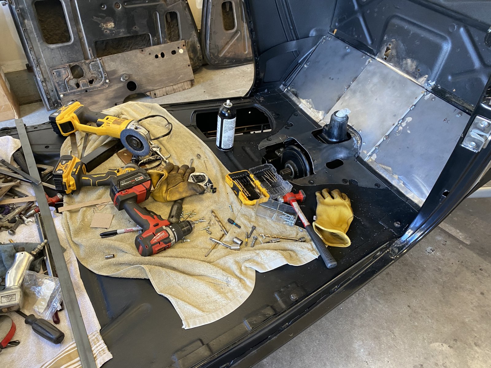 Floor is fitting good! But how does this happen so fast I swear just piles up without me even knowing it the whole garage ends up inside the car!!! And I can’t get to my workbench!!! Geez I hate stopping to clean!!! But now I can’t find crap!!!