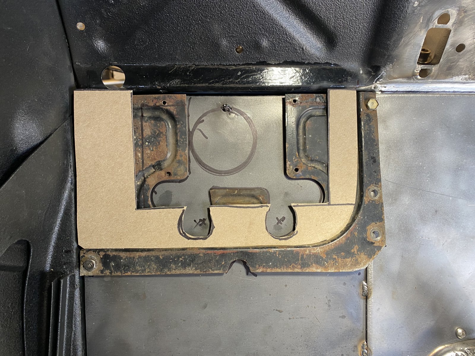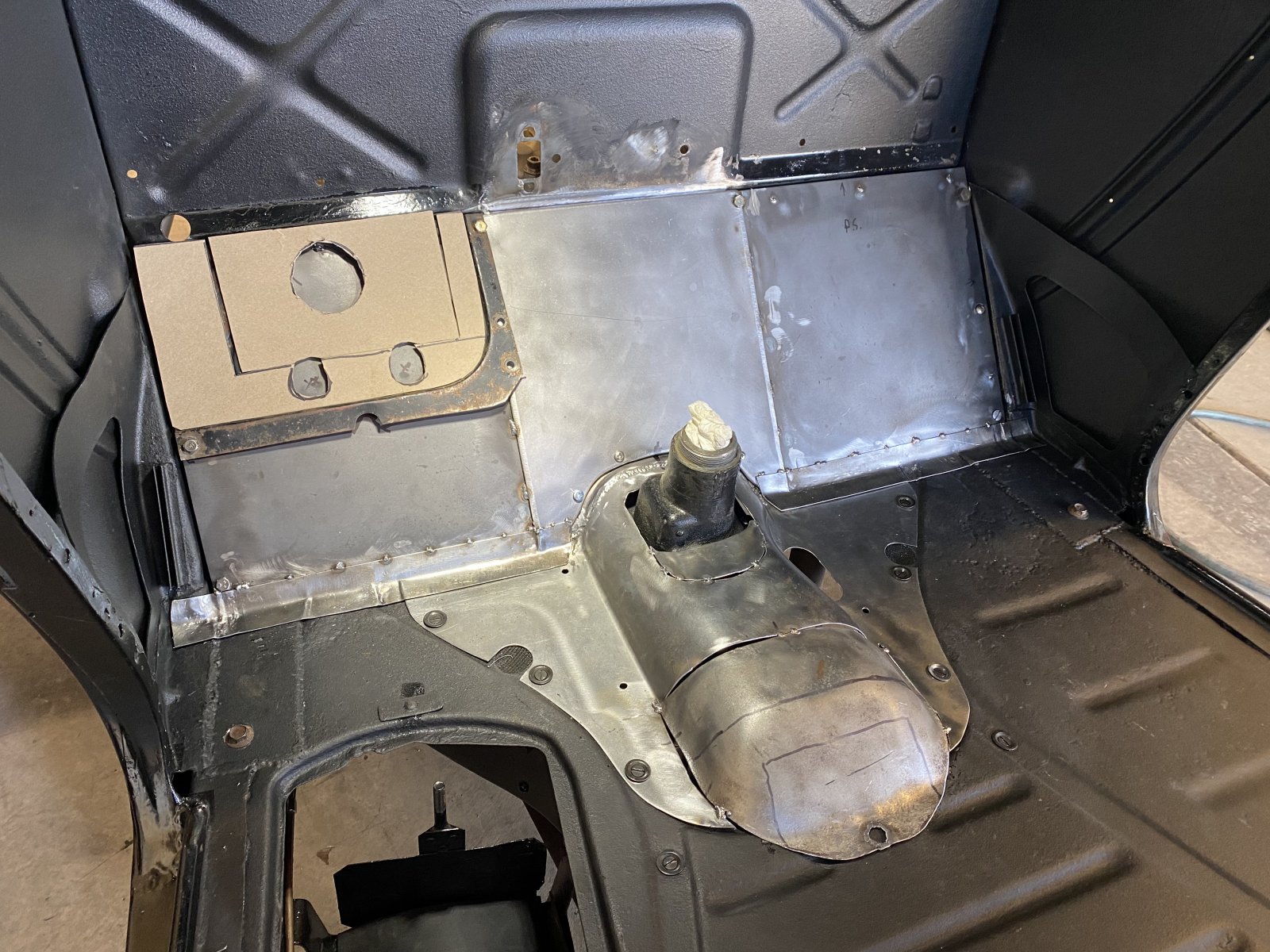 Thanks! Plugging away! Got the car cleaned out…the garage…. Not so much! Floor will be done soon! Everything is fabbed and tacked! Just need to trim the original Pedal piece, and graft it flush in the new metal…. Then the card board templates is the filler, and column mount , I will be temporarily installing My IDidit column for fitting. Getting Excited!!!