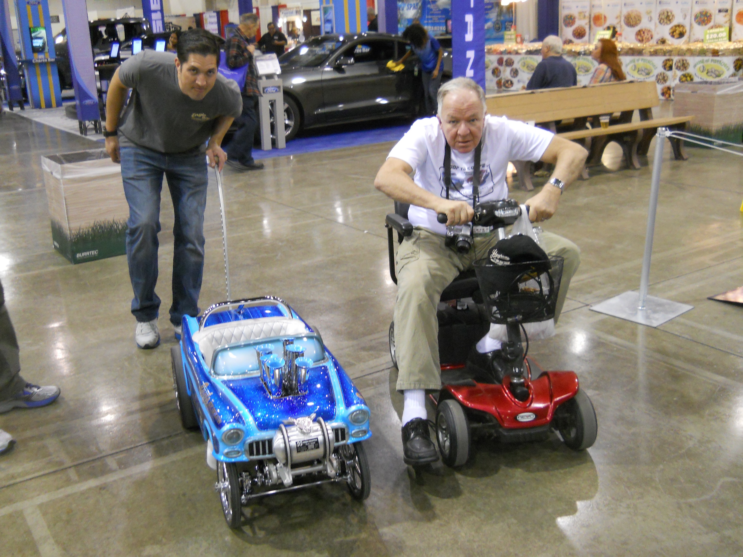1-25-15 Hello from warm and mostly-sunny Pomona. Irish Jr. here. The car is being picked up tomorrow and the weather in the east is not behaving very nicely. I hope I can get home on Tuesday as I have planned. But before I move on to the GNRS, I gotta tell you about the relationship between me and Bob Kasner: Bob is a self-made person who has a lot of fun in life.......especially at making deals and helping people. BUT.........he really doesn't like for the guv'ment to get one more red cent than it is legally entitled to. In fact, Bob is to the right of Attila the Hun and I am a liberal. Though we disagree over politics and such, I hope we still can be good friends............a good sense of humor is also very important. So, in the name of building our friendship, I bought a perfect T-shirt for Bob: Now back to the Grand National Roadster Show........ This is for those who do not know about this show. The highlight of this show, which started in 1950, is the awarding of the nine-feet-high America's Most Beautiful Roadster trophy: The focus of the cars judged for this competition has changed over the years from neatly-executed traditional cars with unique styling to all-out fantastic cars with unbelievable attention to the most minute details.....for which the owners spend a lot of money, sometimes well over $1 million to have their cars built for this very serious competition. HERE'S THE WINNER: 1933 Ford Roadster.....owned by Larry Olson, Sioux Falls, SD and built by Bobby Alloway And here are some of the contenders: This one is all the way from Sweden: But the show is so much more than the AMBR. Cars from all factions of our hobby are on display (but limited to traditional styles and years of manufacture): hot rods, Kustoms, lowriders, resto-rods, motorcycles, race cars, etc. And the GNRS is, in my mind, exponentially better than any car show I have attended. Maybe that viewpoint is a little biased because of experiencing it from this present viewpoint, but I am still blown away by the quality of the cars and the interaction with other participants and spectators. I have met people I only dreamed about. I have met people from other cultures and from around the globe at this show. So here goes with a random selection of pics of cars of all varieties: How about that one? My guess is a group of guys got to joking about this concept and laughed about it until their sides ached. Then, probably with the addition of some quantity of alcholic beverage, decided to build it. Then, laughing as they did it for about the first three months, decided to continue with the build.......which went on for quite a long time, even though the humor faded. But the final punchline of the joke is the smile that it puts on spectators faces. Well done, guys! I'm gonna start a new posting to continue this collage of photos..............See ya there..... Jim Ireland, AKA Irish Jr.