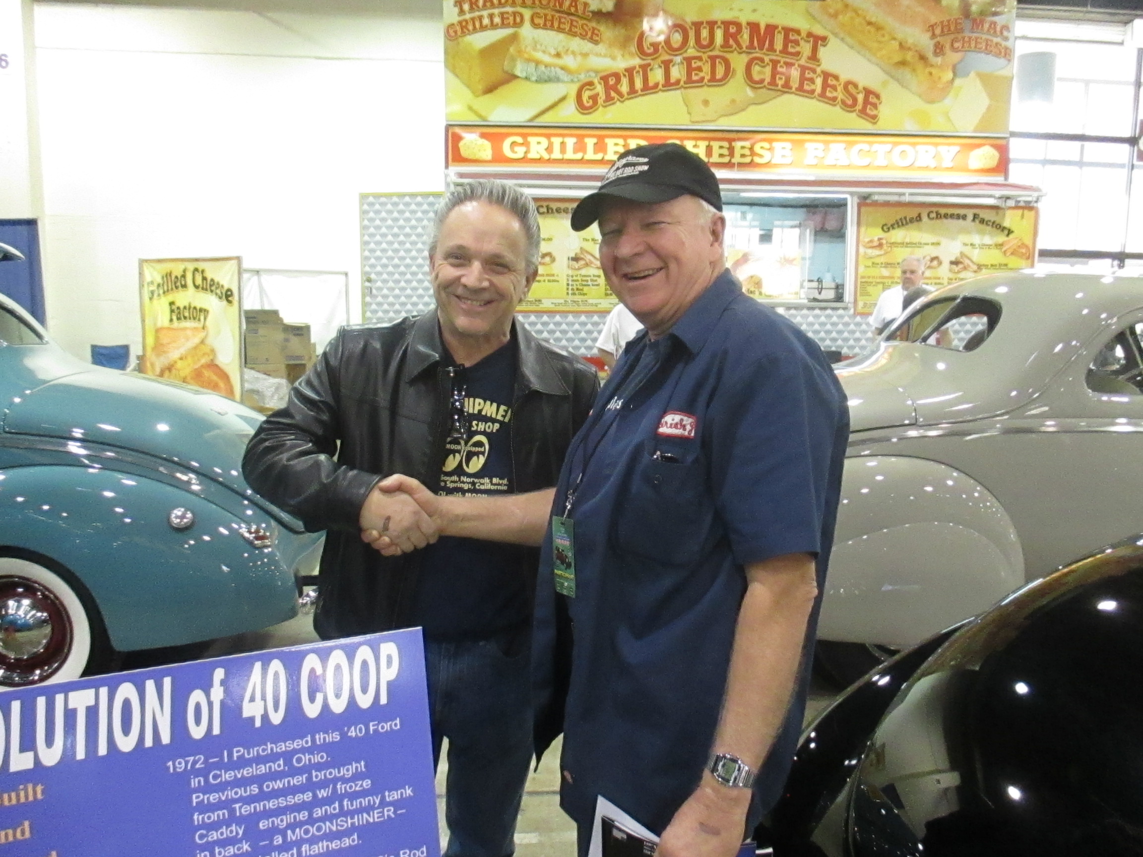 1-23-15 Hello from the GNRS. It's Irish Jr. here......... I guess I rubbed 40 COOP the wrong way, with that spritzer activity and he told me to scram...... So today I will try to show you some of the '40 Fords with which I am proud to have my baby being displayed. I would also like to thank Lee Pratt for inviting me and for his and Roy Brizio's vision to do this neat part of the show. But first, as part of my preparation for this show, knowing that the displays cover several buildings, and my knee would be sorely taxed, I rented an electric scooter for four days. It has been a blessing to help save my knee which gets replaced on February 24. However, when two hot rod buggies meet..............................IT'S A DRAG RACE: Well folks, SNAFU time.......I have taken a lot of really fuzzy photos. I guess I will need to retake them using my tripod or with a flash. The lighting in the buildings is really good, but needs a steadier hand than I have, so I will concentrate on the Forties tomorrow. Meanwhile, this morning, I tried to arrange for a shoot of the owners before the show opened. We were to meet at about 11:30 AM and 18 of us showed up on time to get this photo....talk about herding cats........these just happen to be KOOL KATS: Yesterday, I got Jimmy Vaughan to sign a picture for a fan back in the Rusty Nuts. The picture was of Robbie Bohuslav's dad's fabulous '57 T-Bird....from one Fabulous Thunderbird to another Fabulous Thunderbird. Jimmy's Forty in in the show near 40 COOP. This is really Kool getting to meet Jimmy: That's Jimmy's tan one behind me, with Eric Clapton's black one directly behind me........but more cars tomorrow night. Then there's Tony Miller's '40 Merc-style grille and my '40 Merc-style grille. Both were built without the knowledge of the other's being done and both about the same time.....but I think I made mine a little bit earlier. Interesting........................... Sorry about the delay in posting pics. Check back in later, Jim Ireland, AKA Irish Jr.