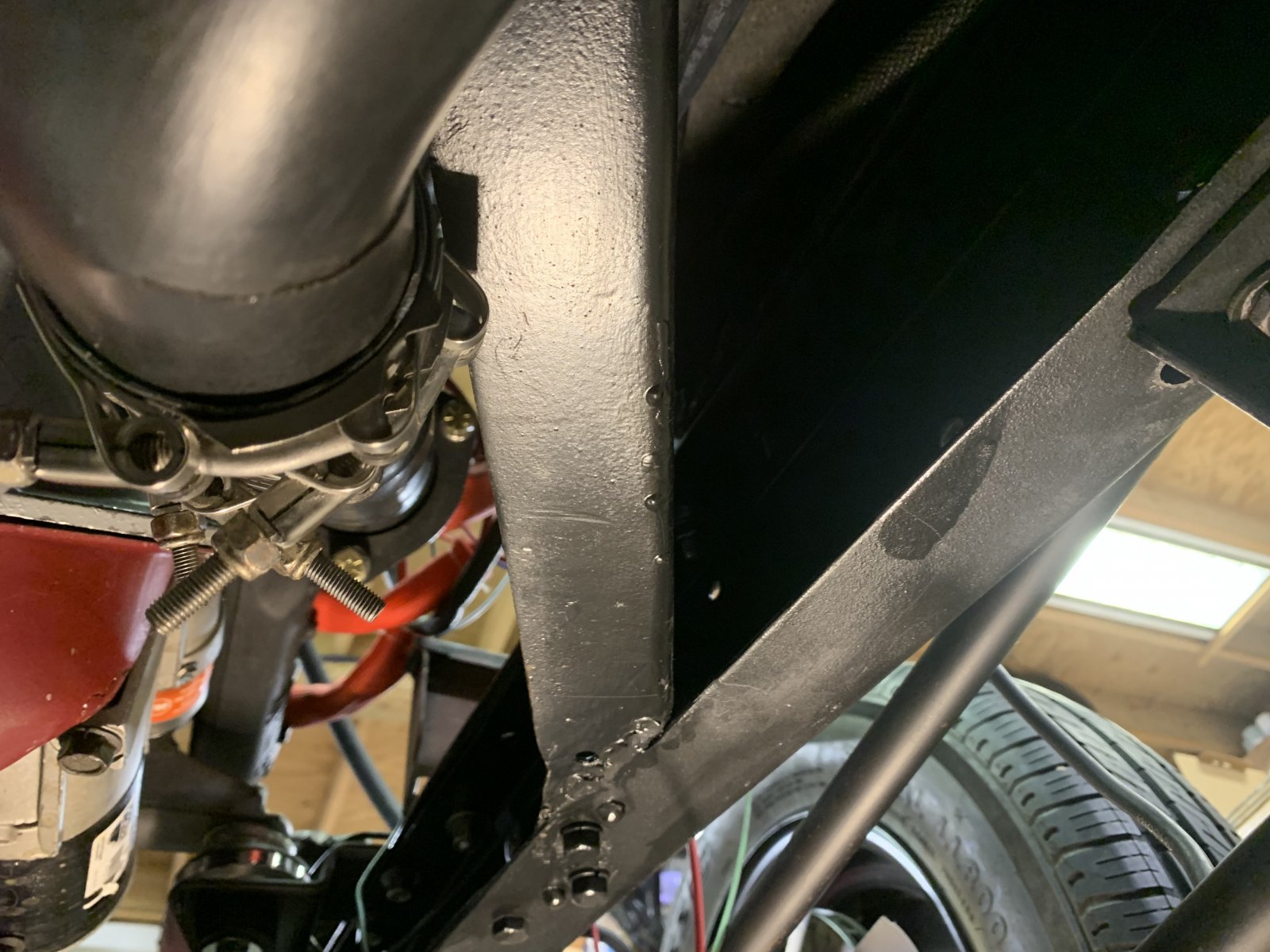 Been working on the back end of the exhaust system as I had to come up with something to hold the tailpipes. The frame was too far away. So, I put a piece of angle iron off the top of the center hitch support and that looks like it will do the trick ….. The unpainted piece is what I added. It bolts in so I can remove it should I need to remove the gas tank ( removing that and the hitch will be a job I hope I never have to do!!). I did a bunch of welding and the welder is doing great (I am still lousy but you all know that!) and with having the welder I am making good progress once again. I have the driver side all bolted up save for the front piece of axhaust off the manifold - I am still waiting on the Titanium pipe wrap. Tomorrow is a little Cars and Coffee in the am, paint up the new parts, and get the passenger side exhaust squared away ….