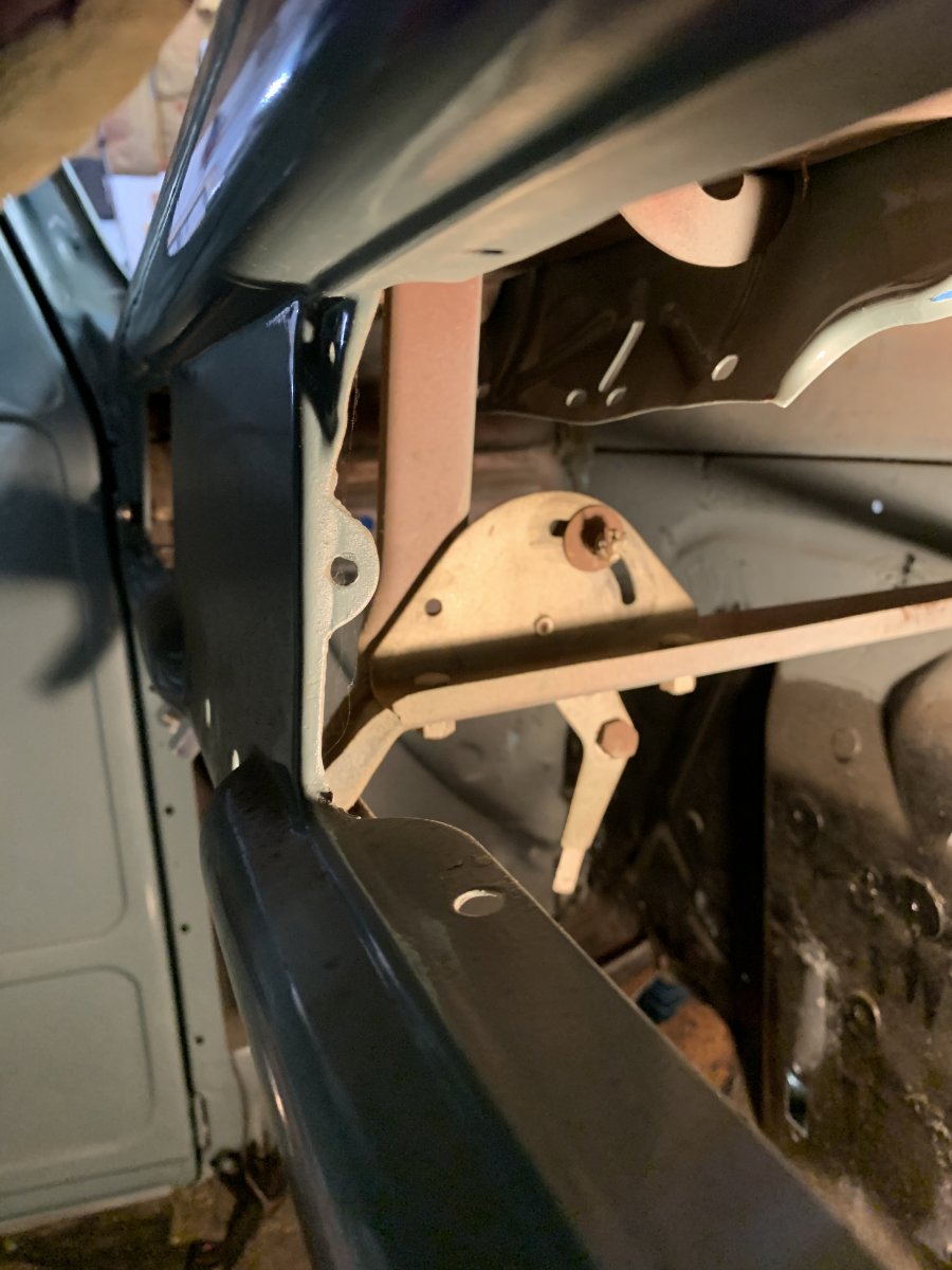Working on the truck but sporadically and mostly small stuff. I have also been working on my coupe correcting some things. Clutch was very hard when it should not have been. Made some adjustments and softened it up quite a bit. My third member 3:23 pumpkin was leaking. I pulled it, had it checked over (the crush collar was the culprit), and working on reinstalling it today. Anyway you look at sit I am having fun in the garage..... The seat folds but the release is the only on the passenger side and tough to get to when the seat is in. Made up an arm for the drivers side and used a metal band to connect them. Now I can release the seat from either side ... The rear upper console mounting block dried enabling me to glue in the extensions .... The piece screwed into my extensions was to square them up and provide a stable surface for my prop. Now back to my pumpkin ......