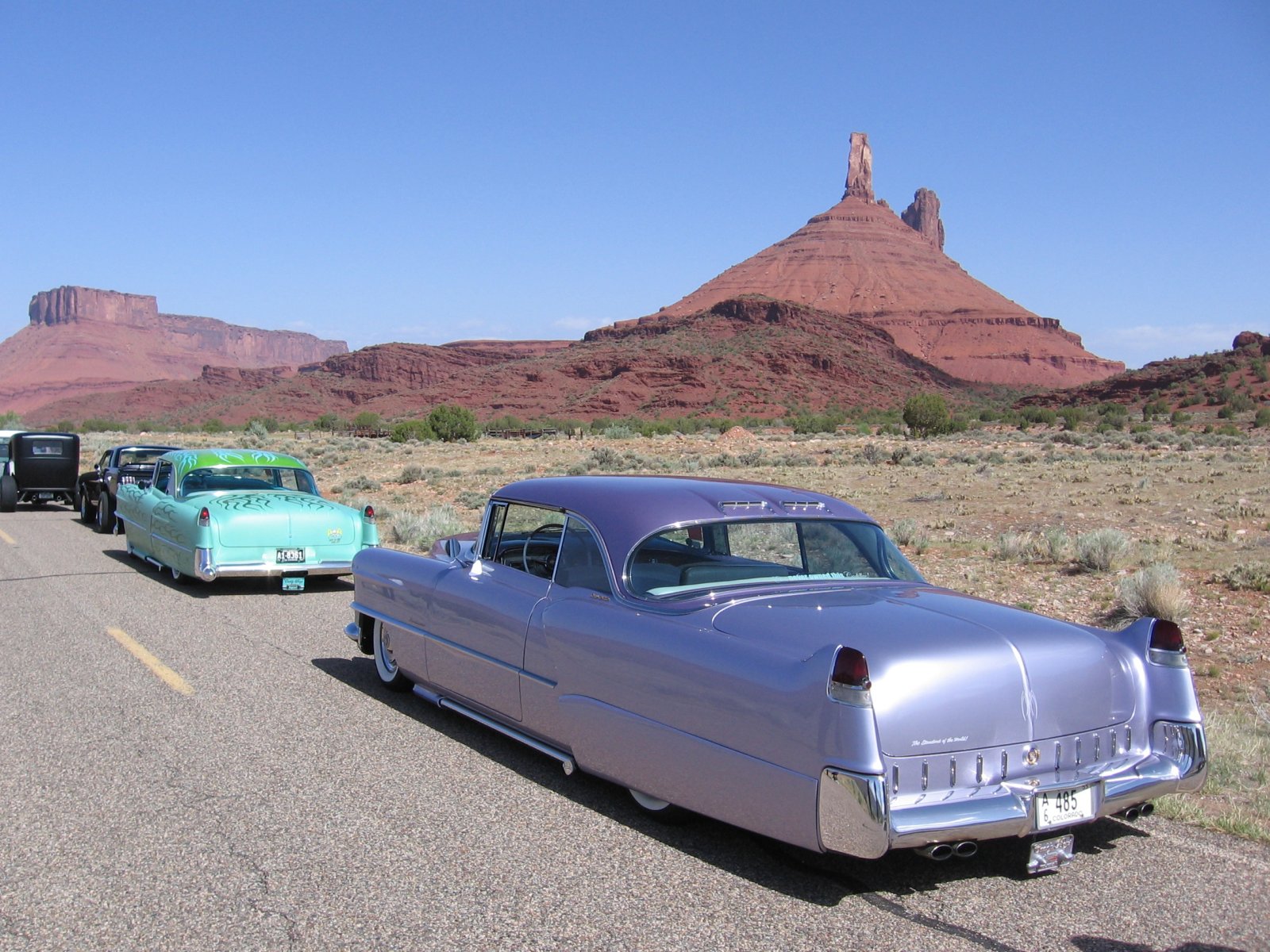 Photo shot in Moab, Utah...my brother's 54 Cad ahead of mine.