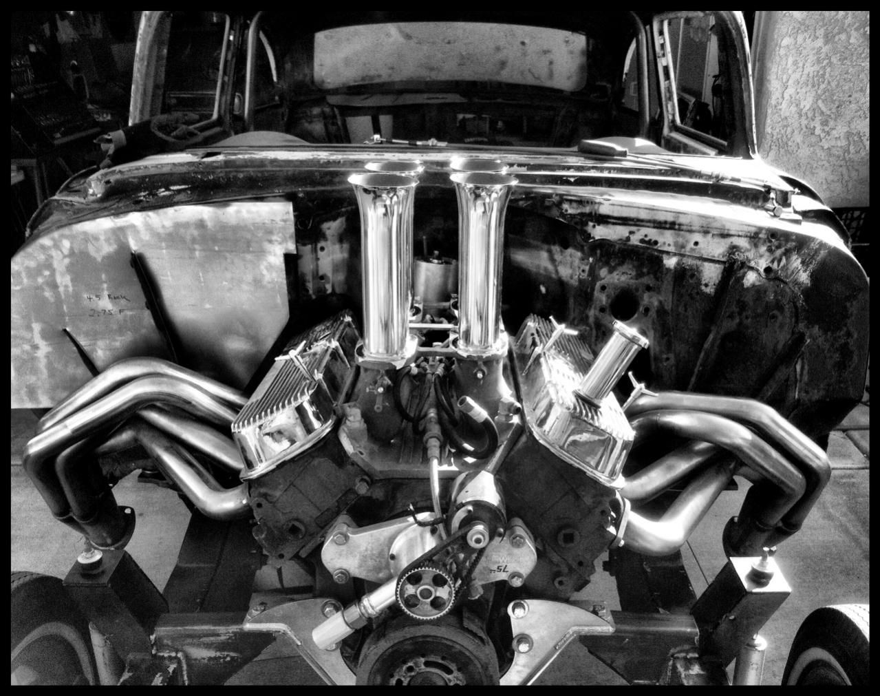 got a few pics to share of the engine and what has been done this weekend. i like how the hilborn stacks just peek over hood but may have wanted 1/2 more...still have to finish the hole in hood and im going to run a 5 1/16 rod around opening and the blend it in to give the hood opening some style..