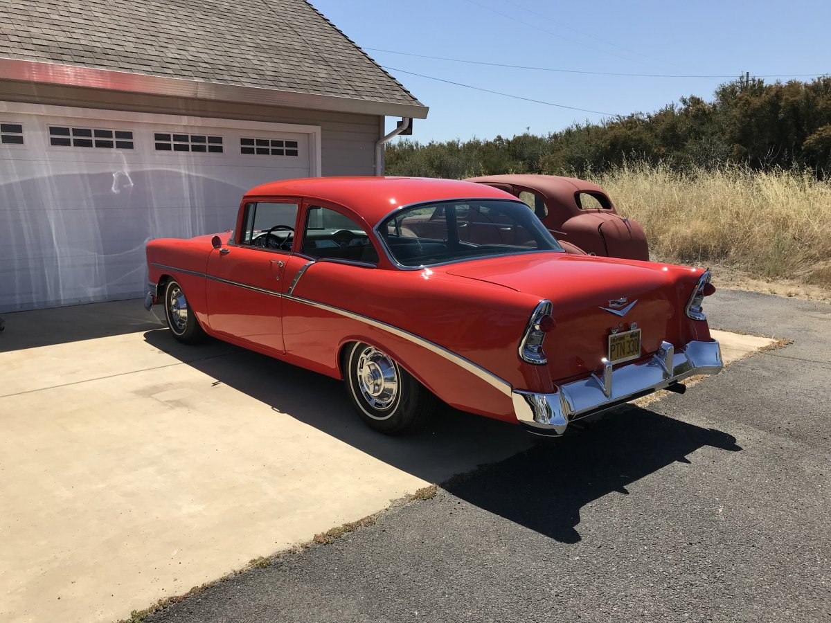 I posted my '56 back in post #46 in flat black, here's an updated photo. It's factory Matador Red now. I made it look just like a friends car from the old neighborhood. I rode to Lion's and to the beach in one that looked just like this way back when I was 13-14 years old. The new engine looks just like the 340 hp 327 that Gene had in his '56 back then. (can't believe I don't have a photo?) After a year with baby moons I finally sprung for some Corvette wheel covers to change things up a little. The jury is still out for me, almost $700 and I kinda like the moons better. I bought some old magnesium American 5 spokes for the front but they don't quite clear the calipers.