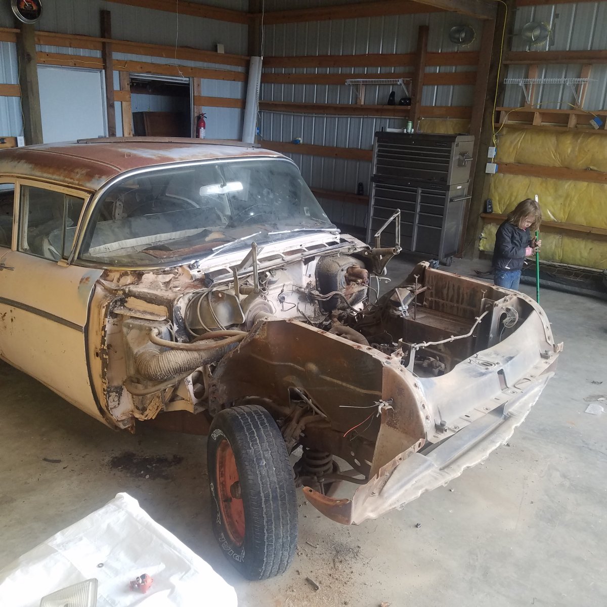 Got a motor. 364 from another 57 it has a 4 barrel so that's pretty cool. Guy also gave me the tranny with it didn't need that but hey I'll take it. Also got a rear end from him for the center section since mine is screwed. All for $200.
