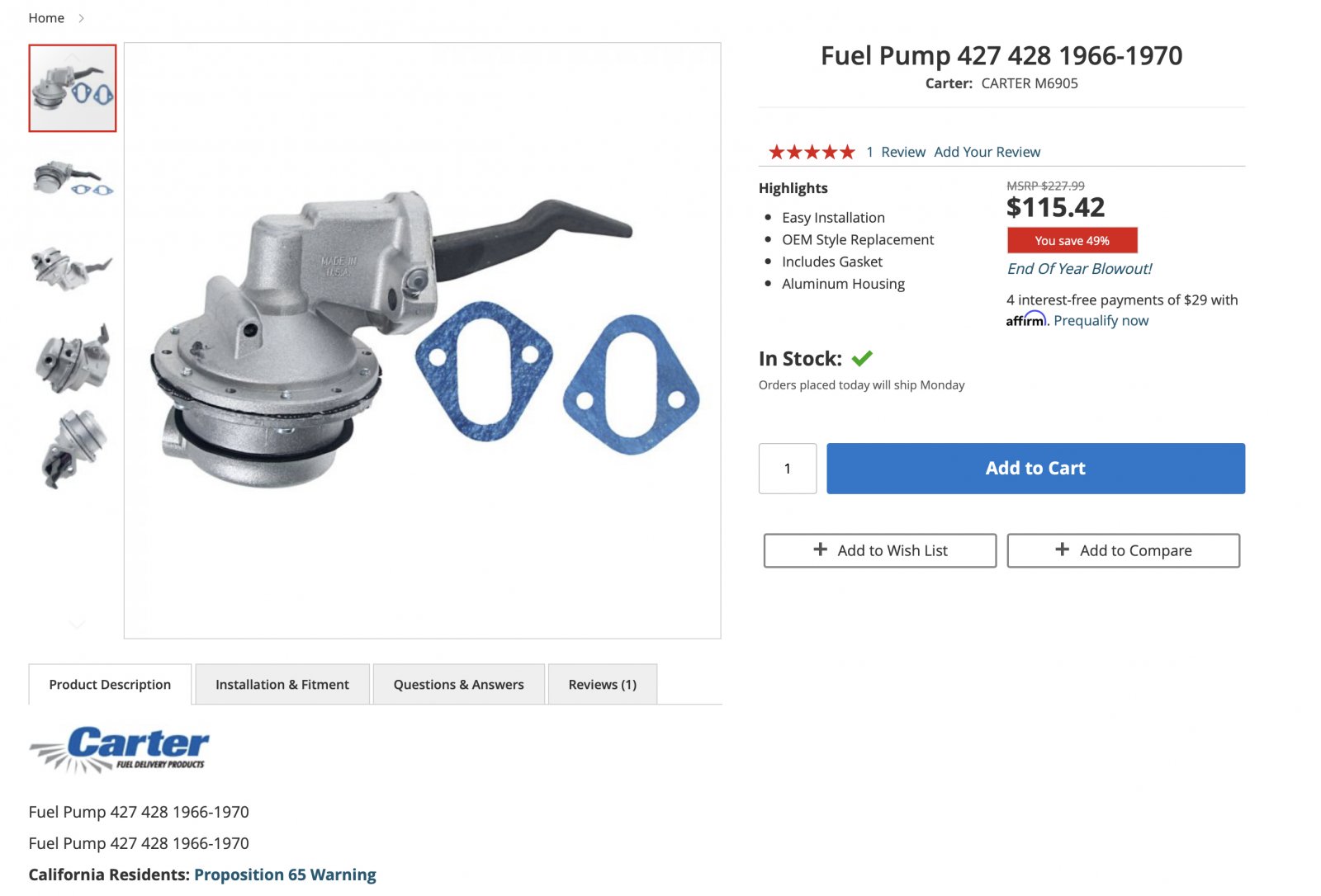 17. I've had several good running 352's in several 57/58 Fords as well as 2 first gen F-100's. I've never said wish I would have held out for a 390. All were just good drivers that just got with it. I agree with losing the dual action fuel pump, but I never ran the one you show. I chose the Carter CRT-M4008. I like the built-in filter with the large replaceable cartridge. They also make this style for the small blocks.