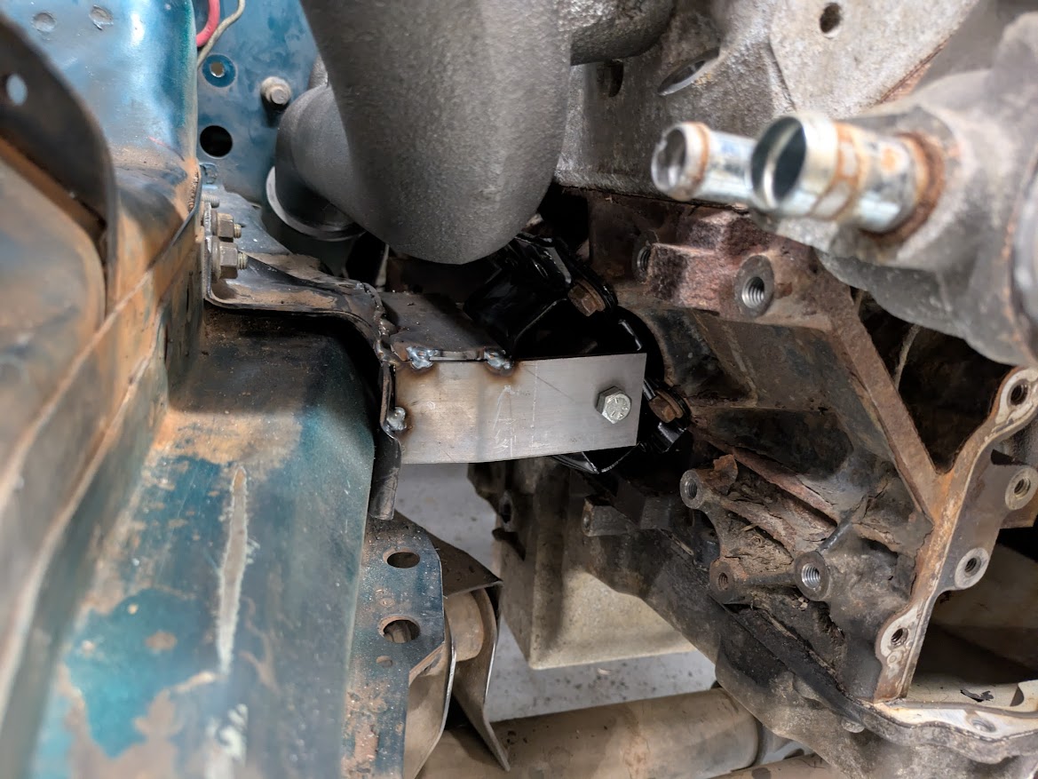working on mounts. This is one of the frame brackets that held the original motor mount. I cut off the horizontal part of it that went to the mount for the inline engine, at about a 45 degree angle, and welded on a plate to build the new mount off of. It'll all make sense when it's in the car...but at least a little progress is happening.