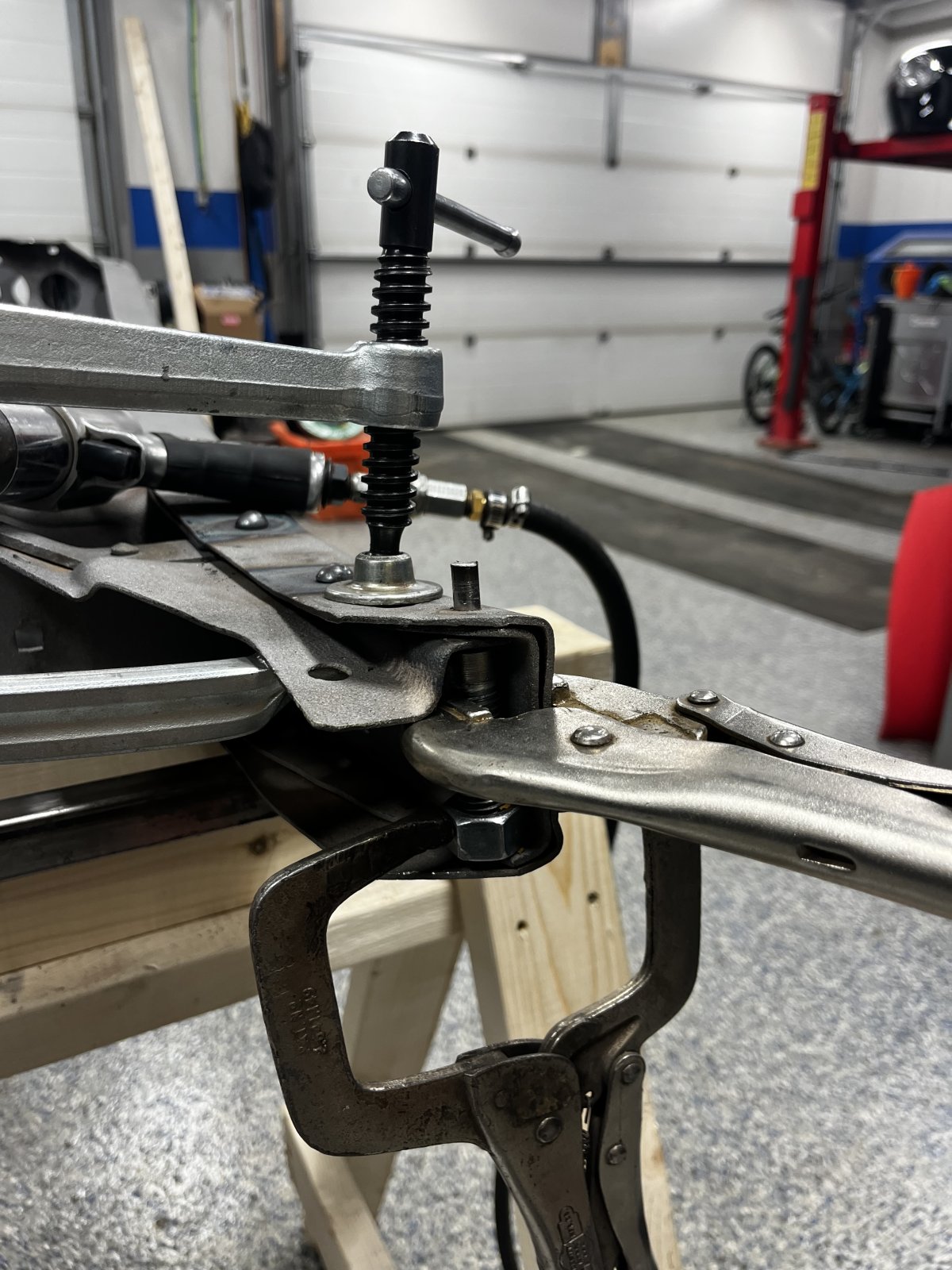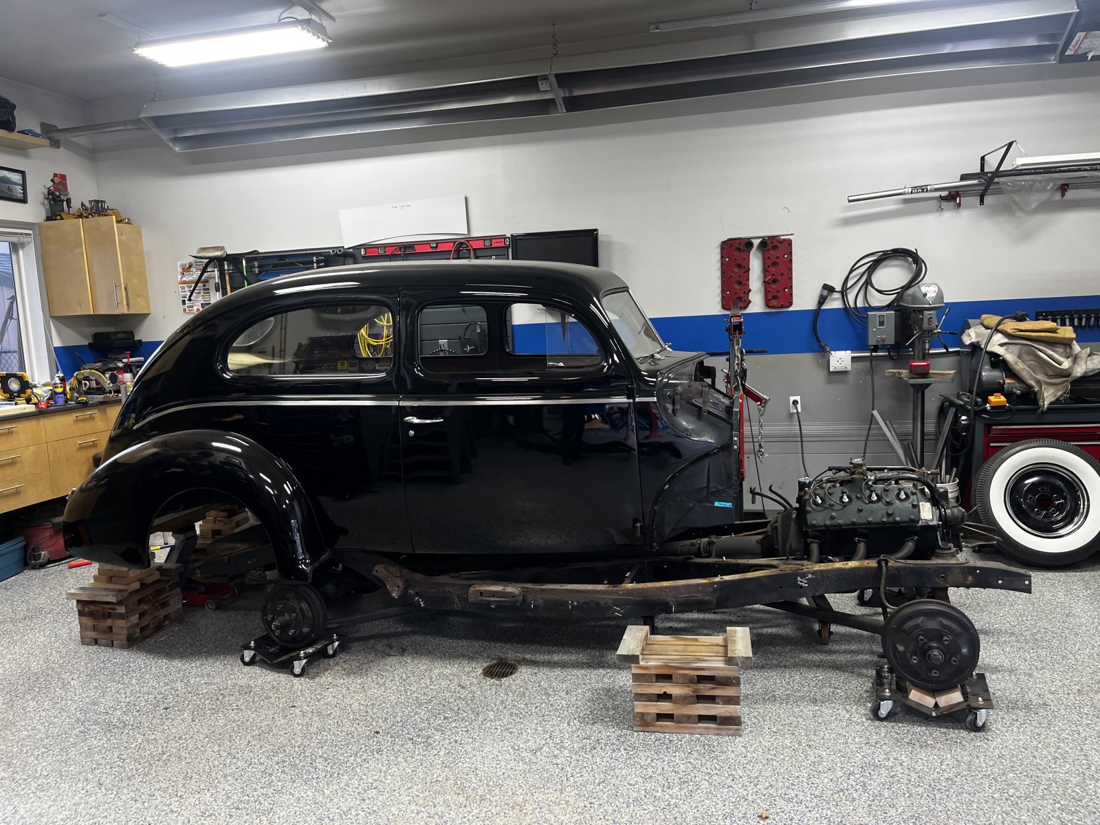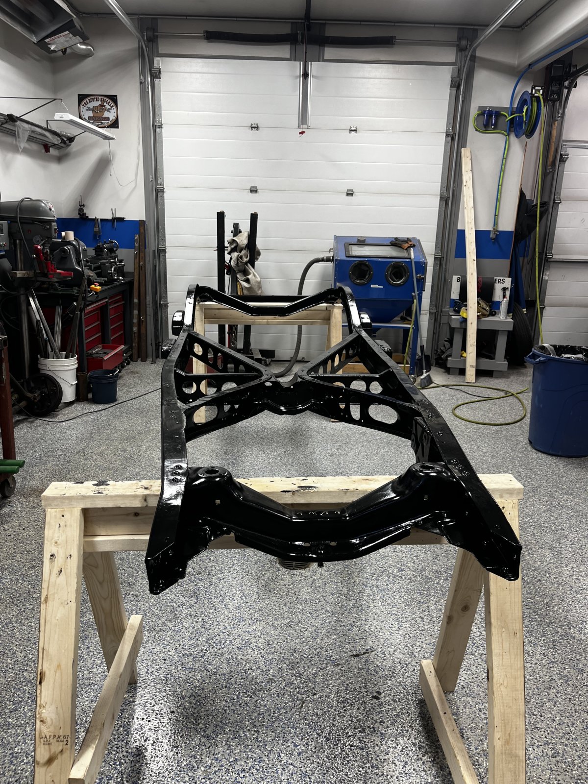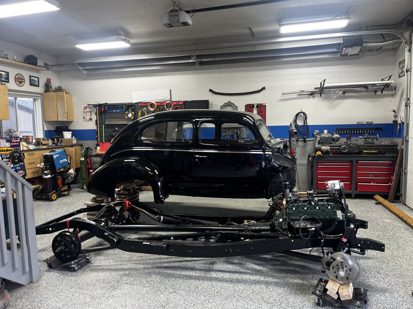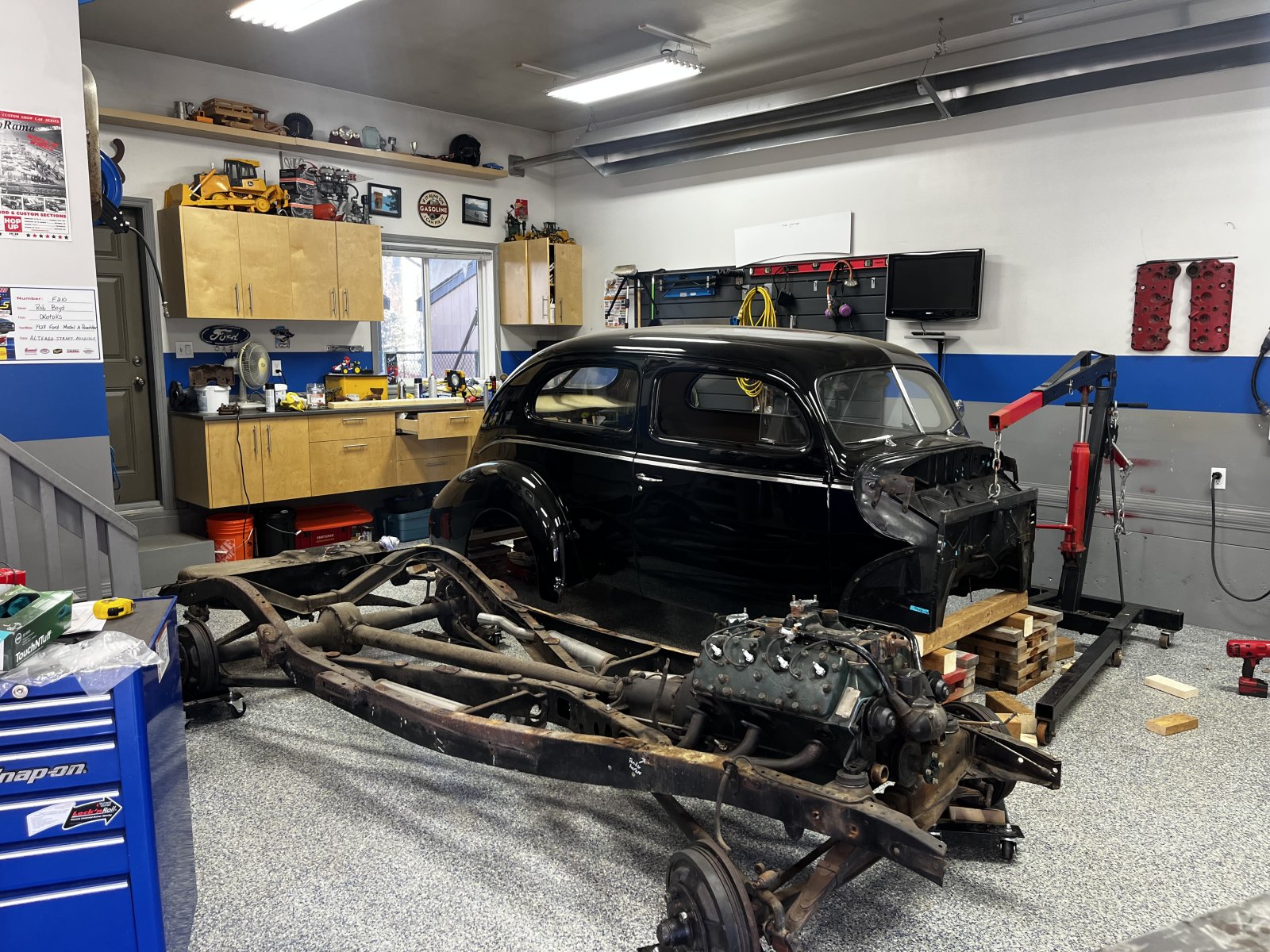 Had a friend stop in this morning he lended a second hand to get the frame under the body. Very nerve wracking but it’s down now.