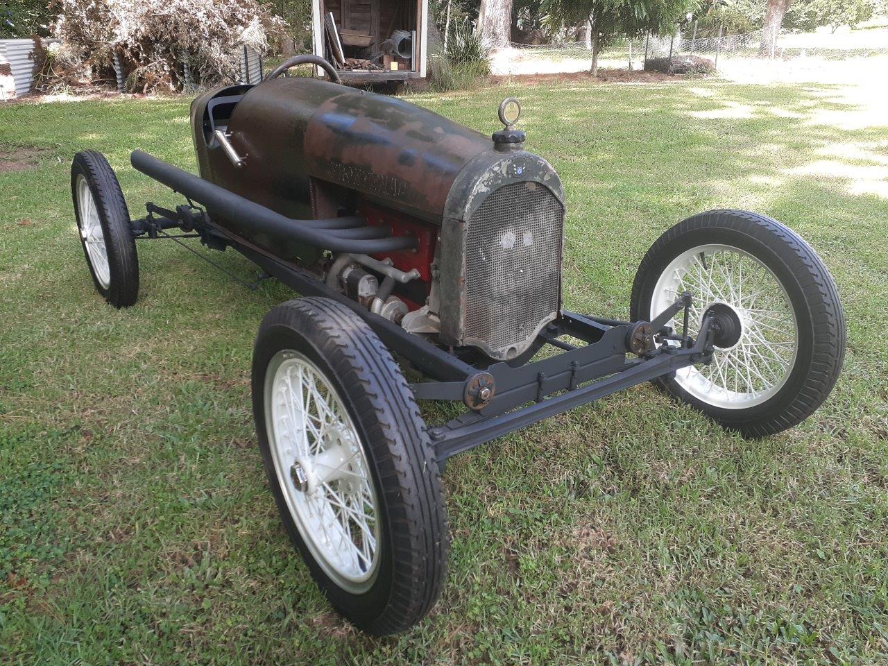 My Buddy in Australia has finally assembled a single stick Fronty with this "Frontenac" radiator using period scorrect parts and an original 1920's very rusted wedge tail body. The body has been hot riveted together using a 3 x 6 foot "Firezone" enamel sign turned inside out that can be seen in the following photos.