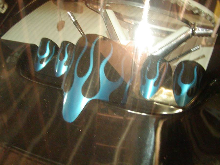 Actually tragic, the damn thing got up and ran away...I got out to stick a steel toed boot into its teeth and it got up and bolted! Anyway, it's better now than it was before....here's a shot of the flames that i laid on the dash cluster....