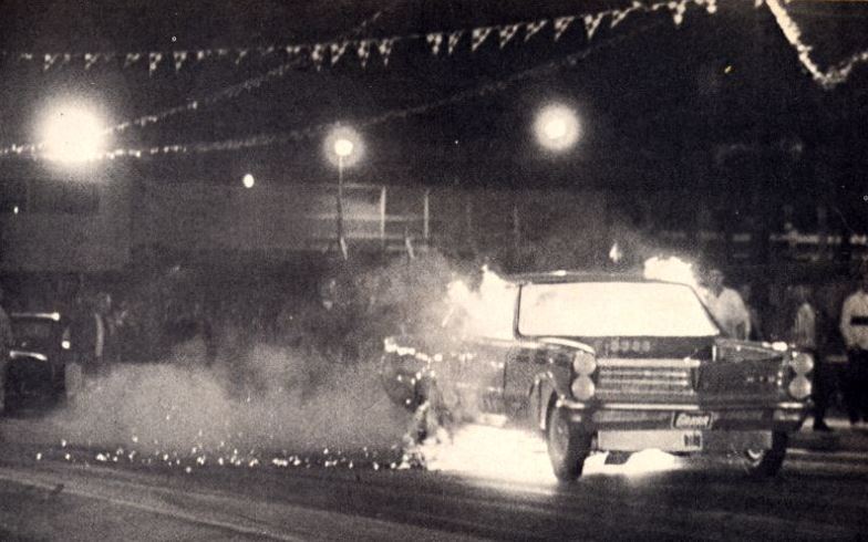 Guided by blueprints from factory Ramchargers engineers, Landy’s Automotive Research finished the job in time to cash in on lucrative late-season match races in the Southeast. Back home in November, Dandy Dick clocked 146.57 (!) mph and won Top Production Eliminator at the same Riverside half-mile meet that produced the preceding Burke & Chastain photo. In mid-December, Rick captured what’s likely this car’s last burnout, ever, in a San Fernando Valley parking lot. Flying Dutchman Plymouth AWB running in C/A vs Moody's Garage coupe in one of the first clashes between the "New" style and older cars.