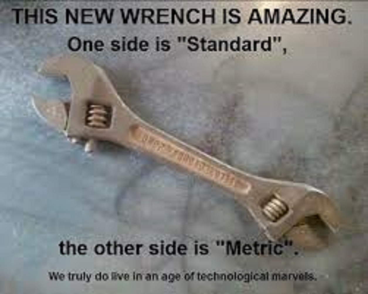 They actually sell a crescent wrench now with both standard & metric markings. I guess for those who really need to know.