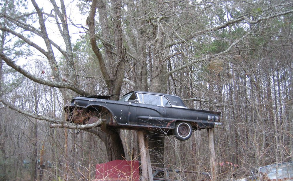 Looks like my cousins T-bird that she and my sister rolled on an exit ramp from a highway! But I don't think it landed that high in the trees just on the roof