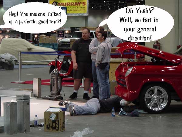 [fat dude in black,talkin' to the dude in the middle]"so,,,uhh should we go over there and ask those guys how to REALLY kustomize a car..or can i stand here and grab your ass some more"?????[dude on floor]"uhhh..hey fat basterd...the cross member broke from your fat ass again..lets take it to the o.c.c. and ask pauly to weld it up"!!!