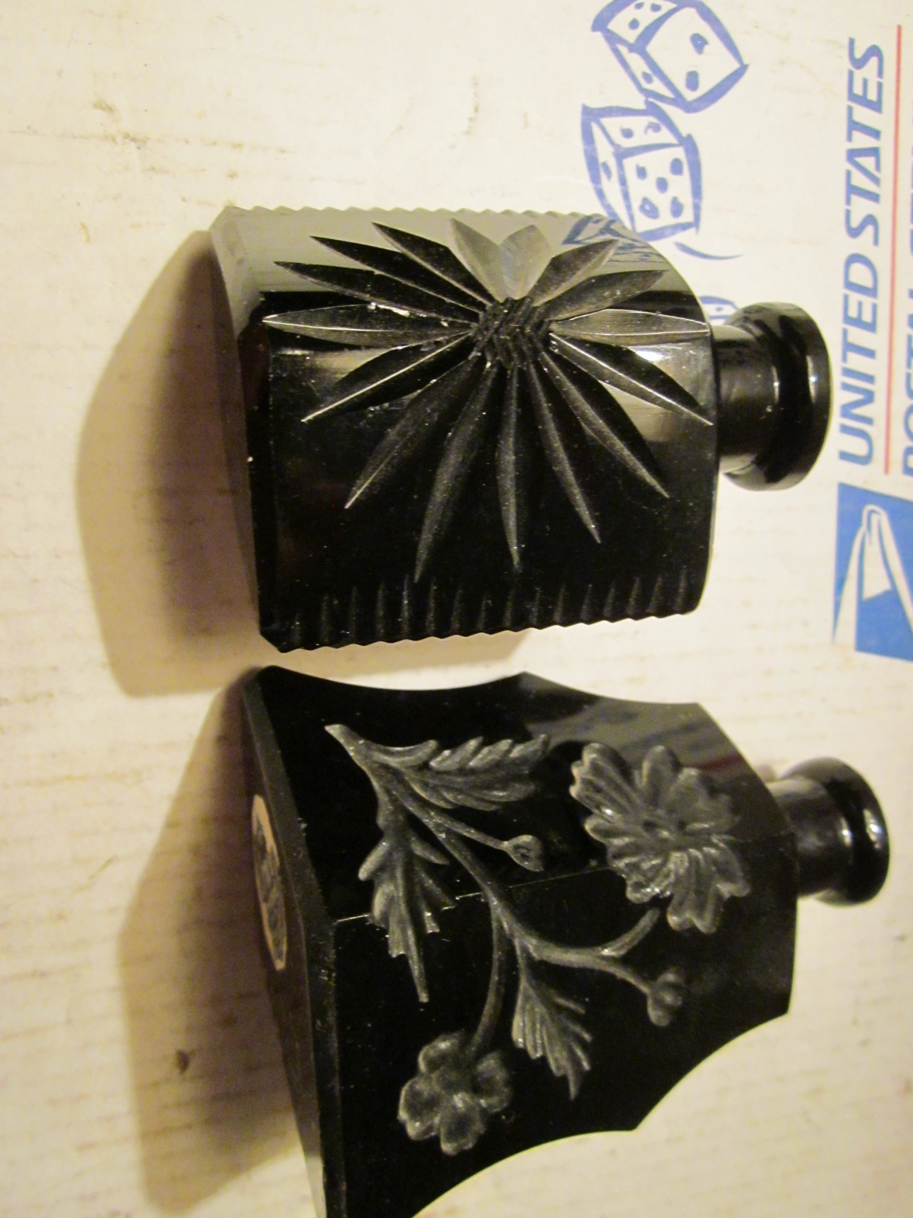 made in czechcsiovakia on the bottom of both bottles. color is a deep purple or black. (it's hard to tell) excellent condition. 3-1/8" & 2-3/4"tall. $35.00 each+ $12.00 shipping each.