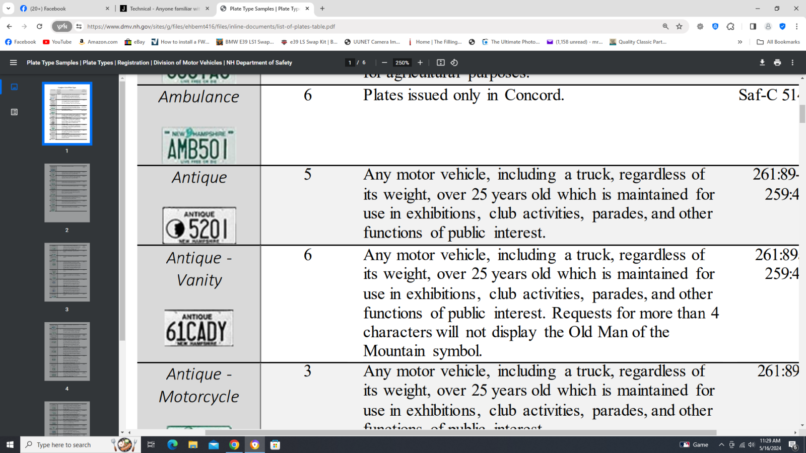 Here in Washington State the "Antique plates" get abused something terrible. the state allows anything over 20 years old to run antique plates because the plates were originally started around the mid 70's and Tri 5 Chevys were 20 years old. The horseless Carriage plates had/have a lot stricter requirements. Sad part is that every vehicle I own is old enough by at least two years including a 2002 VW Passat sedan. Still every state has their own rules and under this discussion only what goes on in New Hampshire is applicable. That includes jumping though smaller hoops some with or without flames to satisfy local regs on top of county and state. Meaning paying the tax to the city that isn't collected by the state and sent back to the city. I remember thinking that I was cutting a fat hog in Texas in 1970 when I registered my car there for about 15.00 rather than the 65 in Washington only to get a tax bill from the county, then one from the city and then one from the school district that made the total come out more than the 65 that I paid in Washington. As far as Macey's issue goes, it looks like the main difference between Antique and Street rod plates is that you have to have the car inspected to qualify it as a street rod. That may be to eliminate late model crap rods that are fenderless from getting street rod plates. Personally I would just contact the inspection station, tell them that you built it as a fenderless street rod and need to have it inspected and leave out the "when" part. Before that, make sure all of your ducks are lined up dress right dress and cover down. Go down the list in Section 266:113 and make damned sure that it complies with each line on that list that don't include fenders or hood. A lot of us have been in the been there done that when it comes to dealing with license clerks who are less than knowledgeable about anything out of the absolute norm. The license office I deal with here (15 miles away) is the best I have ever done business with, the owner is the best at knowing what is going on that I have ever met in any license office. He also knows exactly who to call in the main state office if he has an issue that he can't figure out too. Won't cut corners or cheat for anyone but he and his well trained clerks know what they are doing. The people in the city hall are often stuck with the job with little training.