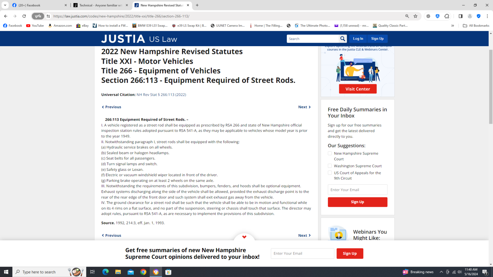 I have a '34 Ford Hot Rod that I have had difficulty registering and inspecting in New Hampshire. Town hall initially gave me a hard time with registration. They couldn't figure out if I was supposed to register as antique or go for street rod inspection. I got frustrated and just registered it with normal passenger plates. Now, for inspection they told me that I need to abide by all the same rules as "normal" cars because I have passenger plates, rather than antique or street rod plates. I have most of the items, but lacking fenders or a front bumper. Anyone else in NH able to inspect a car without fenders/bumper on normal plates? Or did you go for antique or street rod registration? Thanks, Mat