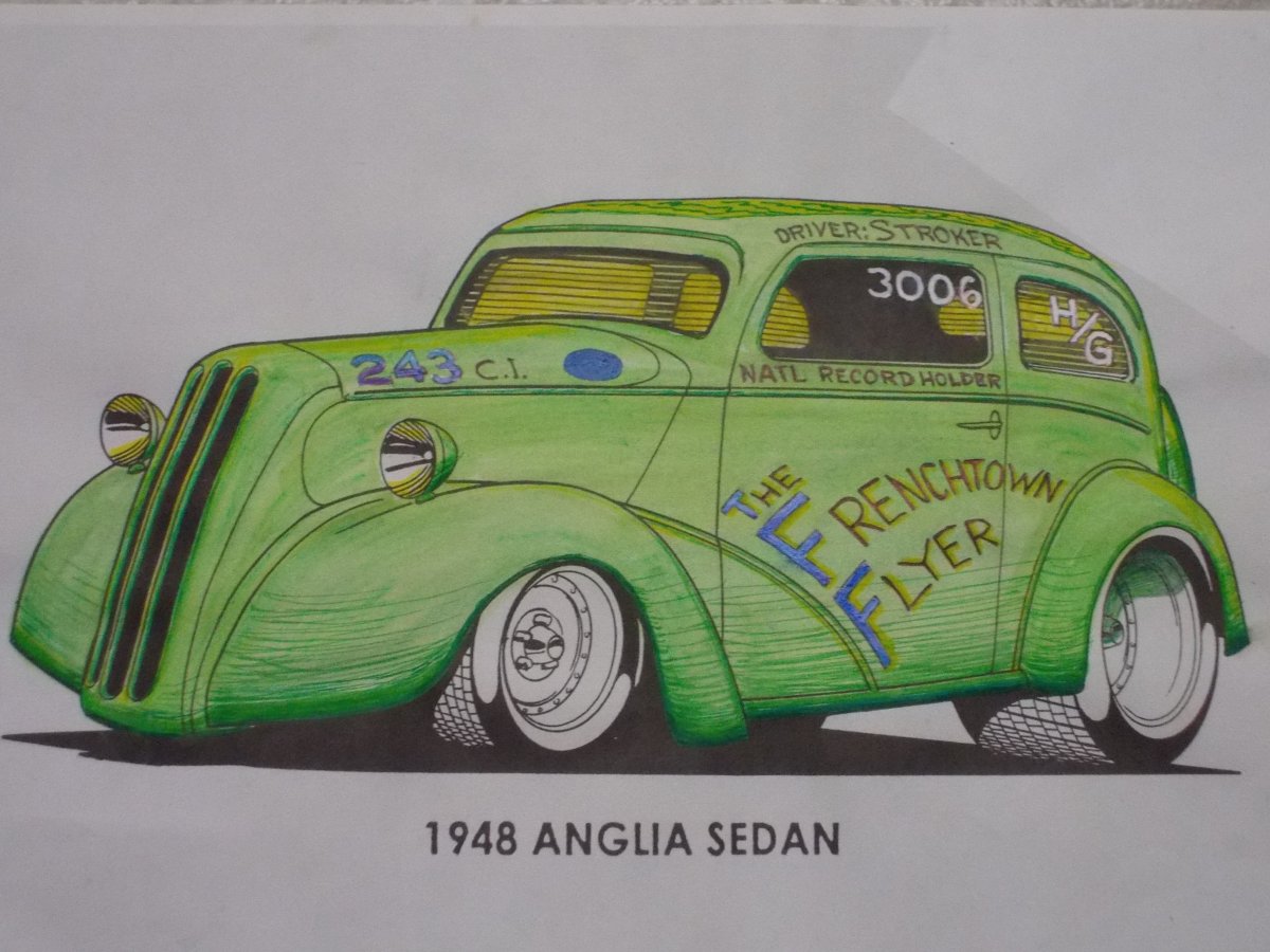 I dont have pics but if I remember it was at a place called FRANS PIT STOP, It had a v6 ford motor, a55 chev rear en, and anson wheels Fran had built 2/4 rect angle frame . and it was decent , When we went back a few weeks later Jake was welding the frame to the body, the first uni body street rod!!!