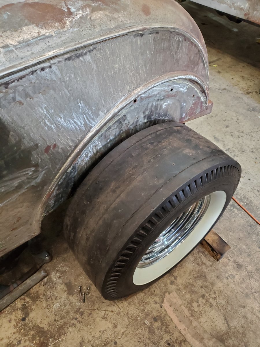 8. These are BIG Radir/Mickey Thompson slicks, as they are 10" wide for a 15" rim. Not sure on the height though Fitness, but they are tall. Wheels are OE Wheel Vintiques chrome reverse. Never cared for the "universal pattern" chrome reverse - spot on 5 lug wheels are the best choice. In any case, make sure your slicks are "cheaters" so your local police cannot bust your chops. In my mind, running slicks can be the crowning touch to any nostalgia hot rod!!!