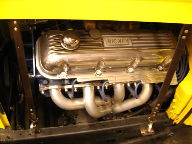 I have a 427 Chevy in mine, Ill take some pics tonight for you. Just a 4" recess firewall, small hump for a 5 speed, no tunnel. With the radiator in the stock location there is no room for a decent fan. I will move it forward an inch or so next time its painted. And even with blockhuggers they burn the side panels. I run just the top of the hood. Steering is tight with one heim in the middle.