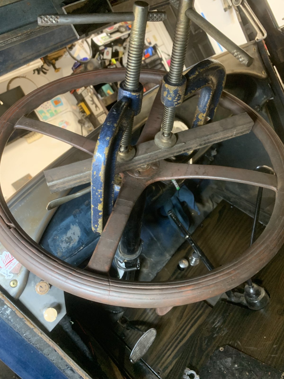 I was running out of things to do, so I decided to remove the original red steering wheel. With the chop, the wheel is too big and not having a column drop makes it even more in the way. home made puller